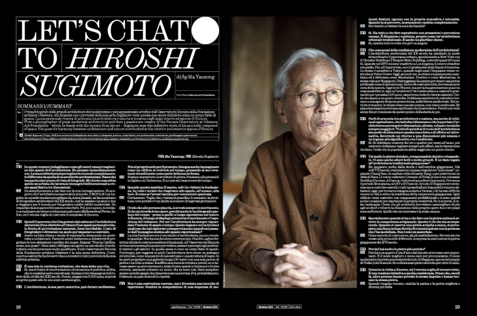 Il dialogo tra Ma Yansong e Hiroshi Sugimoto è uno dei momenti più intensi del numero. Sugimoto parla del suo Osservatorio Enoura, finanziato interamente con i proventi della propria attività artistica, opera definitiva che continuerà a costruire finché avrà vita, come di un corpo fatto di spazio: gallerie di pietra allineate ai solstizi, bambù che cambiano ad ogni angolo, fossili di cinquecento milioni di anni accanto a pietre del tempio di Tōdaiji. Un'architettura che misura il tempo senza orologi, che fa sentire il peso della luce sul pavimento come un dito. La sua critica al modernismo trionfante, alla città-Manhattan globalizzata che distrugge la natura per costruire pietra artificiale, non è nostalgia: è un'etica della permanenza.