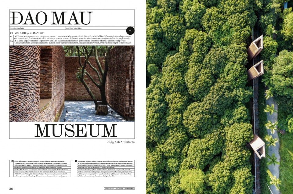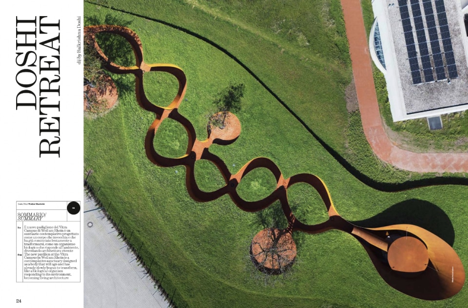 Nel corpo centrale del numero, i progetti parlano linguaggi diversi ma condividono una stessa tensione verso il sensoriale. Walter Mariotti racconta il Doshi Retreat nel Vitra Campus di Weil am Rhein, prima e ultima opera costruita fuori dall'India da Balkrishna Doshi, completata postuma nel 2025, come un corpo metallico e musicale che attraversa il visitatore prima ancora di mostrarsi: gong e flauto emergono dal terreno, risuonano nelle pareti d'acciaio concave, attraversano il corpo; un mandala di ottone martellato a mano rifrange la luce nello spazio, mentre la pioggia entra da un'apertura zenitale. Un santuario nato da un sogno, due cobra intrecciati, immagine di kundalini, che finirà rovina, e in quella fine troverà la sua eternità.