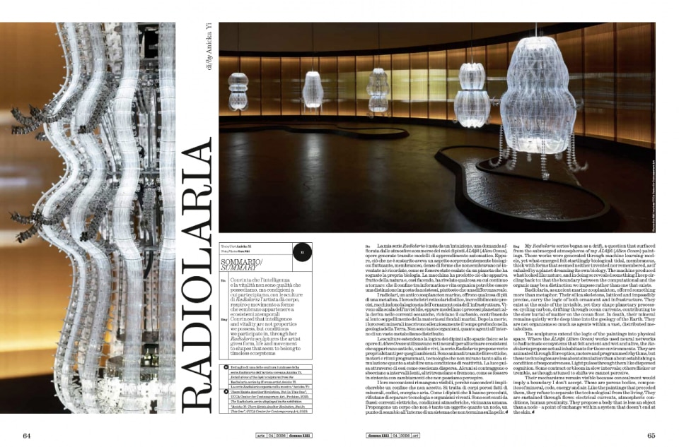 Yung Ho Chang racconta la Vertical e la Horizontal Glass House di Atelier FCJZ sul lungofiume di Shanghai: ogni primo dell'anno, intorno alle undici del mattino, l'ombra dell'una coincide perfettamente con la forma dell'altra. Come un corpo e la sua ombra: inseparabili. Nguyễn Hà porta il Museo e Tempio Đao Mẫu di Arb Architects ad Hanoi, costruito con cinque milioni di tegole di terracotta recuperate nel raggio di trentuno chilometri: una pelle che racconta il tempo, ossa ancorate agli alberi di longan esistenti nel giardino, carne fatta dei rituali Hầu Đồng. Anicka Yi porta la serie Radiolaria, sculture luminose animate da fibre ottiche e motori, ispirate all'antico zooplancton marino i cui scheletri di silice scrivono il tempo profondo nella geologia della Terra, come risposta alla domanda su cosa significhi essere un corpo poroso, fatto di minerali, codice, energia e aria.