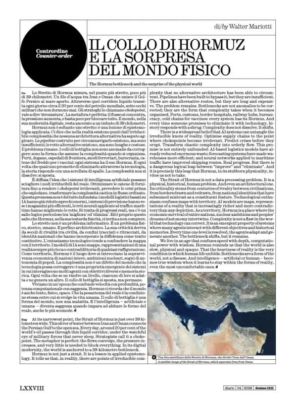 La rubrica Contrordine porta questa architettura del pensiero verso il mondo: trentanove chilometri, la larghezza dello Stretto di Hormuz nel suo punto più stretto, attraverso cui transita ogni giorno circa il venti per cento del petrolio mondiale. I modelli di intelligenza artificiale sono mappe, non territorio. C'è un salto logico pericoloso tra migliorare ed eliminare la complessità. Il collo di bottiglia è una forma del mondo, non una malattia. E l'intelligenza, artificiale o umana, diventa saggezza quando impara ad abitare le forme del reale, anche le più scomode.