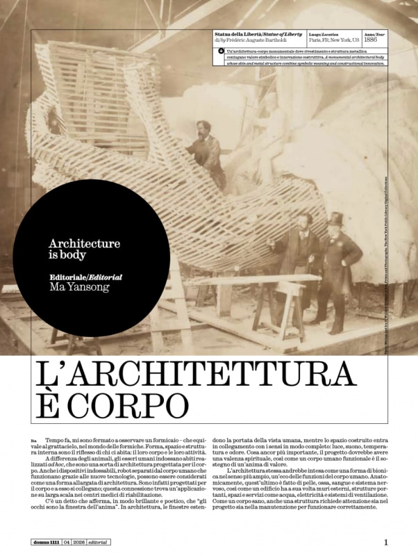 Ma Yansong, guest editor 2026, apre con un editoriale che ha la forza di un atto poetico. Da un formicaio osservato per caso, il grattacielo nel mondo delle formiche, dove forma, spazio e struttura sono il riflesso di chi li abita, alla Statua della Libertà in costruzione sotto le volte affrescate di una chiesa, traccia una genealogia del corpo in architettura che è anche una critica al presente: troppe città, troppi spazi pubblici progettati contro il corpo umano, contro la sua libertà, la sua dignità, la sua voglia di stare insieme. L'architettura come corpo è anche, allora, un atto civile.