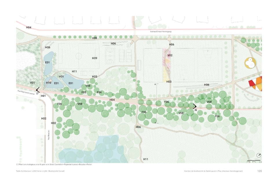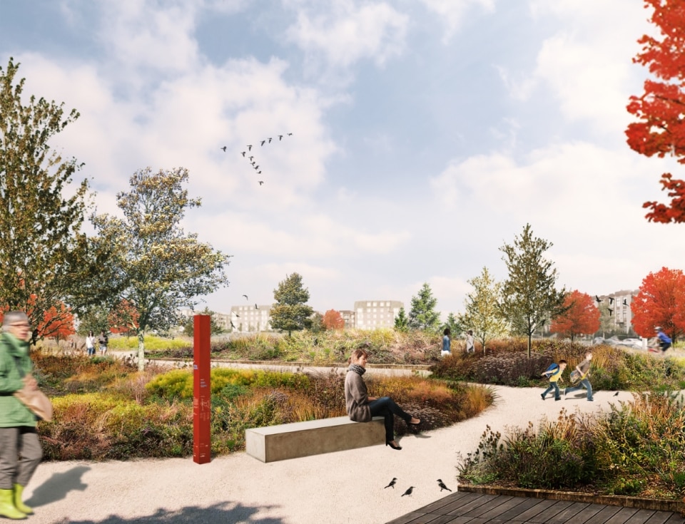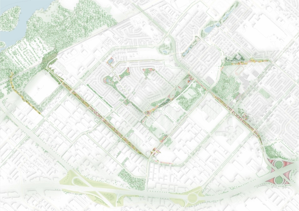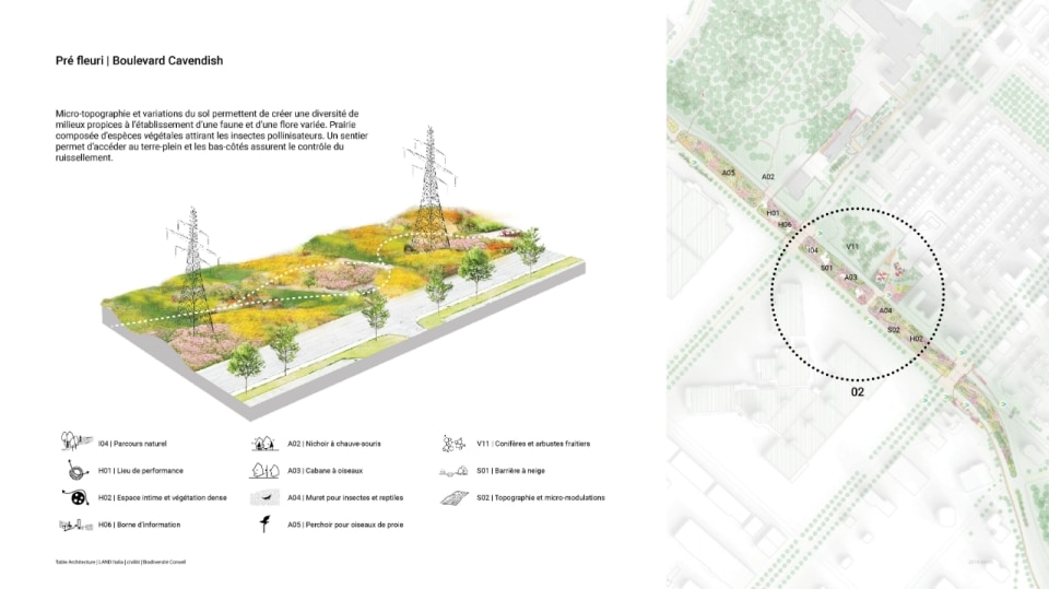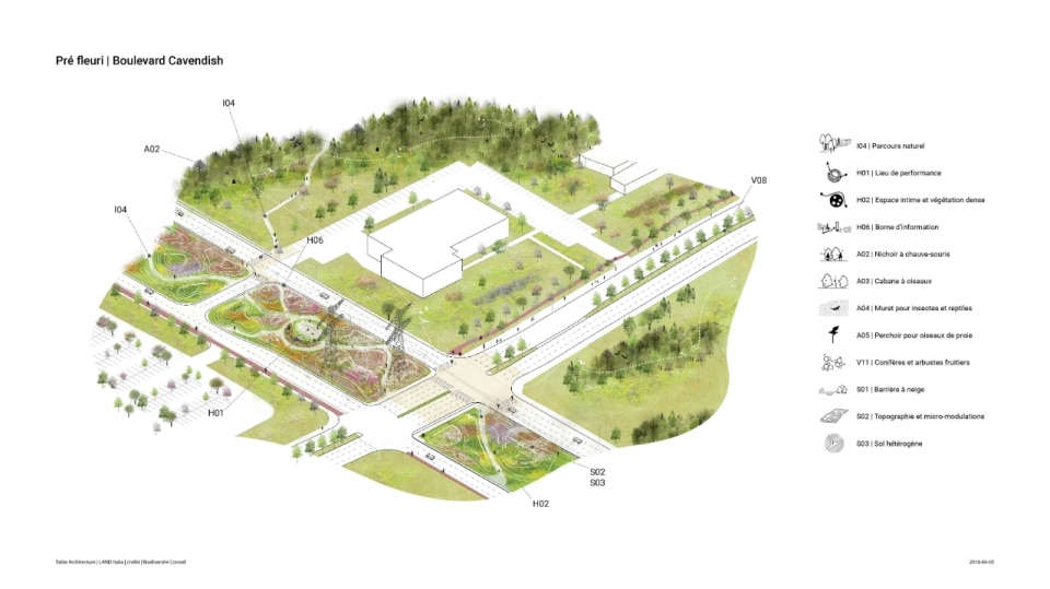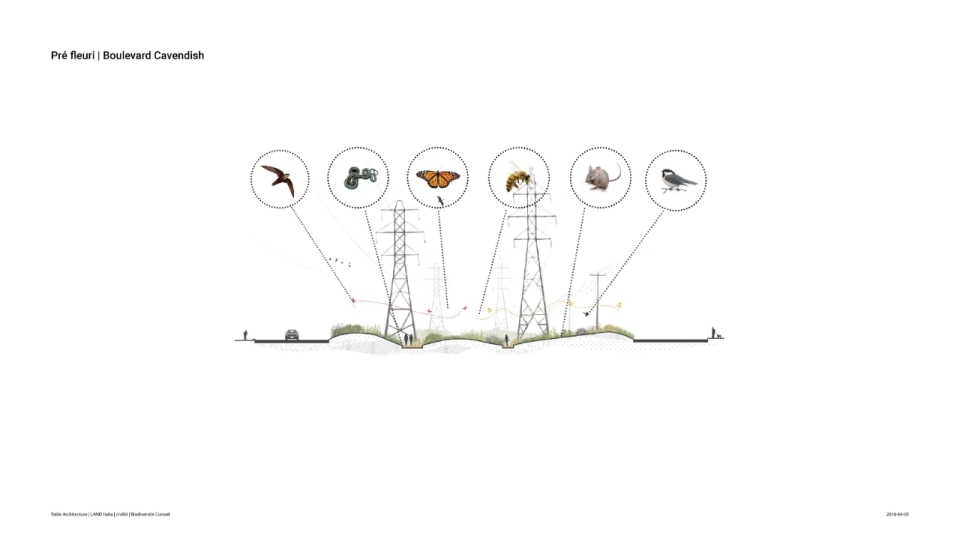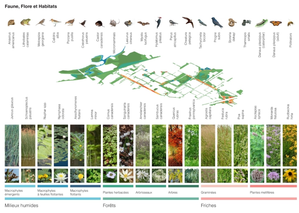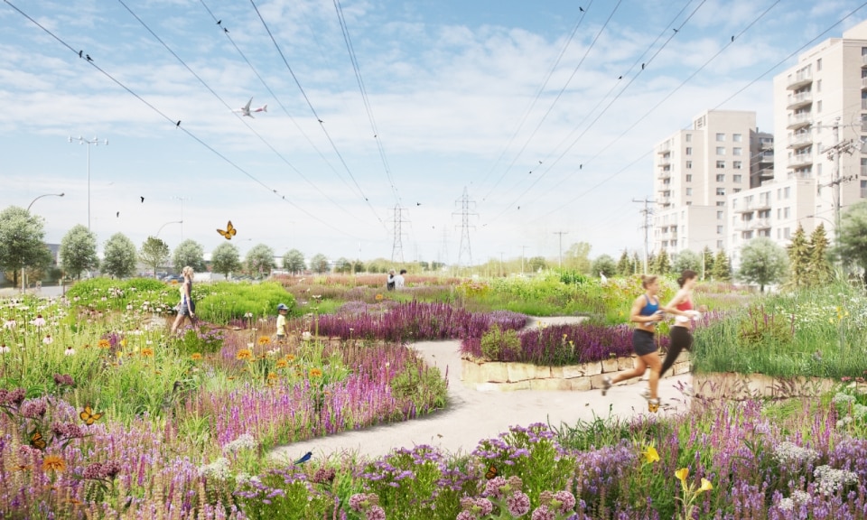 Il progetto ha riguardato la realizzazione di un sistema di infrastrutture verdi e blu che fa da scheletro di un nuovo ecosistema. Oltre alla funzione ecologica di rafforzare la biodiversità e ristabilire la continuità tra i fulcri naturalistici della zona (le aree boschive del Parco Marcel-Laurin e di Cavendish-Raymond-Lasnier-Beaulac-Poirier, i parchi naturali Bois-de-Liesse e Bois-de-Saraguay e il torrente Brook Cree), l’intervento si prefigura nel tempo come un “laboratorio vivente”, dice Kipar, per testare nuove e replicabili sinergie tra natura e spazio antropico. Percorsi interpretativi, aree di sosta e dispositivi didattici, prati fioriti per insetti impollinatori e piccoli animali e una topografia articolata su rilievi disegnano la geometria di un territorio dove i flussi dei diversi biotopi esistenti sono mutuamente interrelati. Il risultato è un corridoio ecologico unitario, capace di restituire l’habitat perduto a fauna e vegetazione e, al tempo stesso, di riattivare per gli abitanti una relazione più consapevole e diretta con la natura.