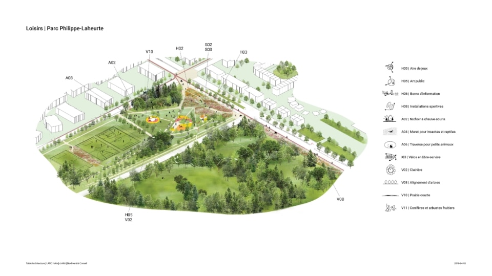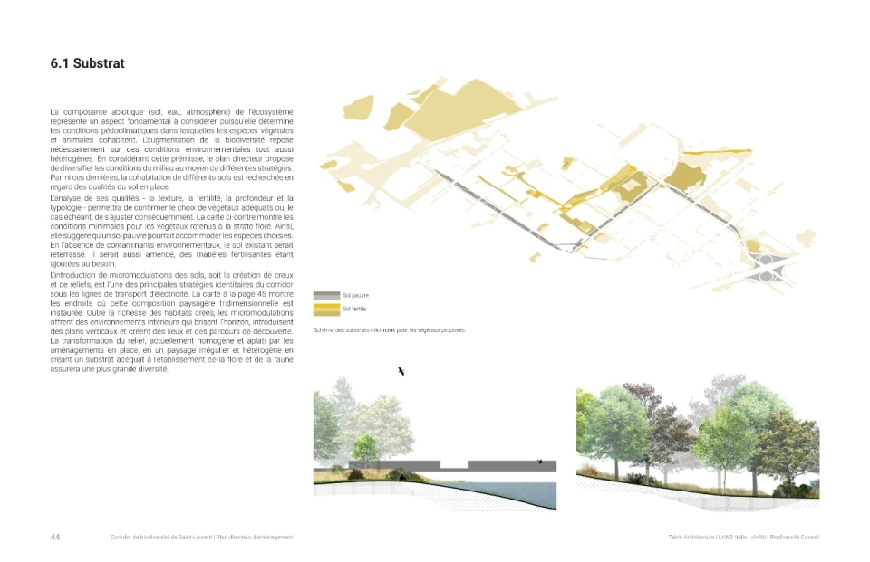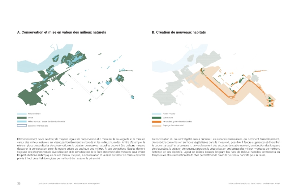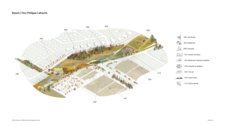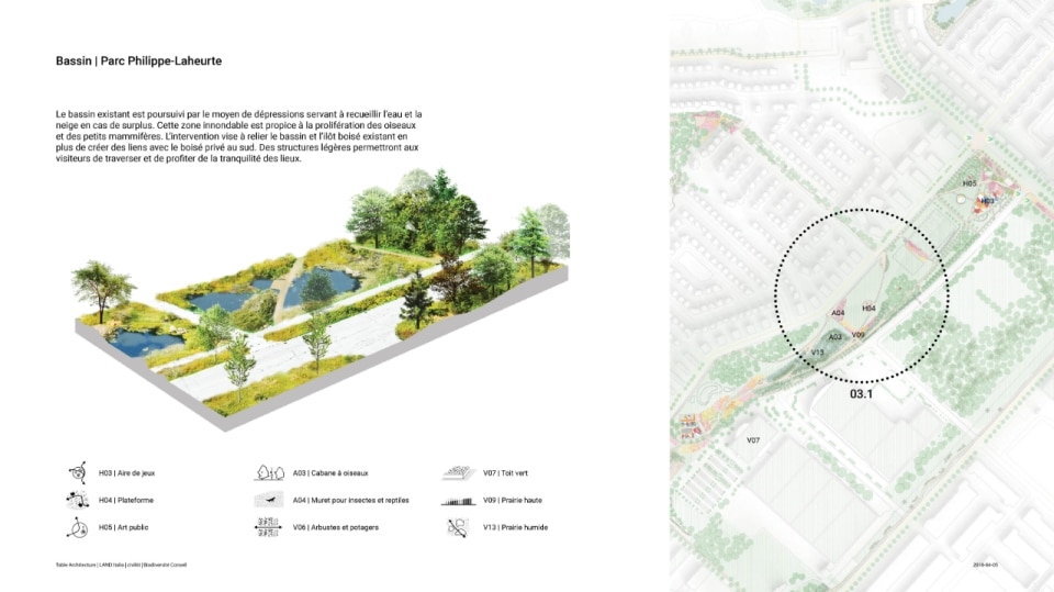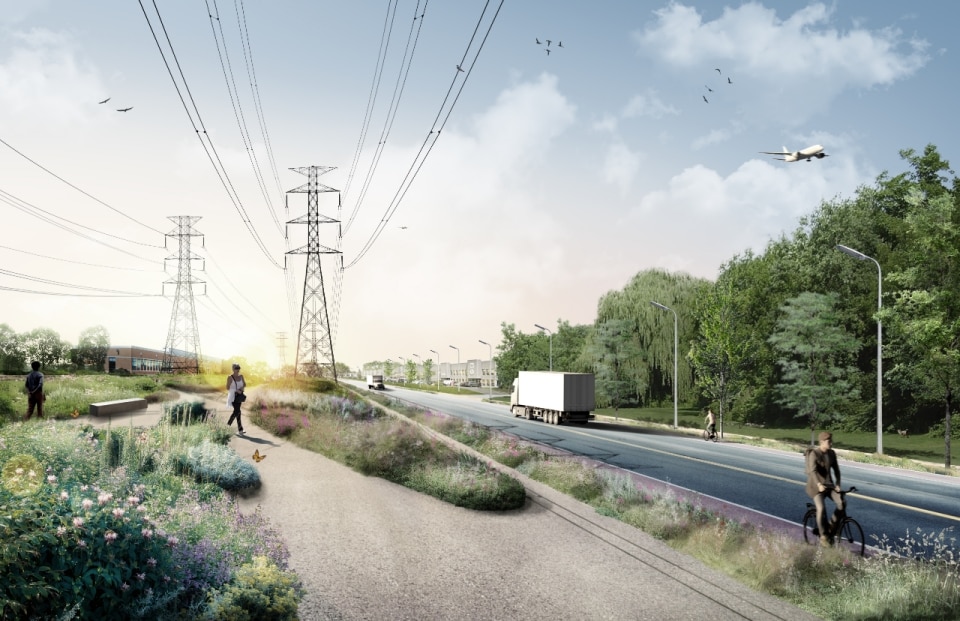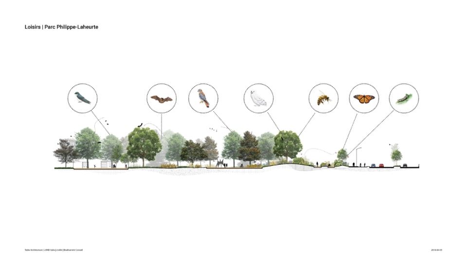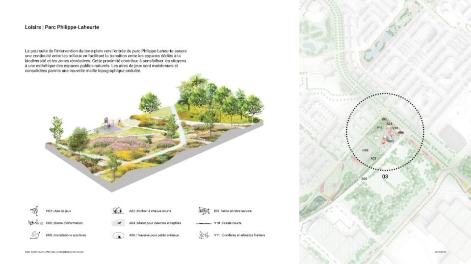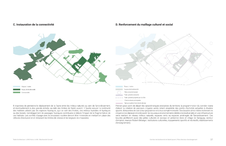 Il progetto ha riguardato la realizzazione di un sistema di infrastrutture verdi e blu che fa da scheletro di un nuovo ecosistema. Oltre alla funzione ecologica di rafforzare la biodiversità e ristabilire la continuità tra i fulcri naturalistici della zona (le aree boschive del Parco Marcel-Laurin e di Cavendish-Raymond-Lasnier-Beaulac-Poirier, i parchi naturali Bois-de-Liesse e Bois-de-Saraguay e il torrente Brook Cree), l’intervento si prefigura nel tempo come un “laboratorio vivente”, dice Kipar, per testare nuove e replicabili sinergie tra natura e spazio antropico. Percorsi interpretativi, aree di sosta e dispositivi didattici, prati fioriti per insetti impollinatori e piccoli animali e una topografia articolata su rilievi disegnano la geometria di un territorio dove i flussi dei diversi biotopi esistenti sono mutuamente interrelati. Il risultato è un corridoio ecologico unitario, capace di restituire l’habitat perduto a fauna e vegetazione e, al tempo stesso, di riattivare per gli abitanti una relazione più consapevole e diretta con la natura.