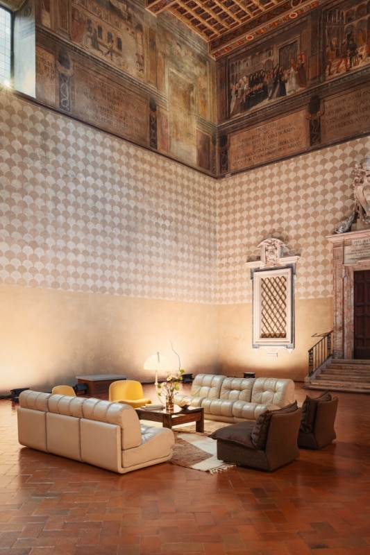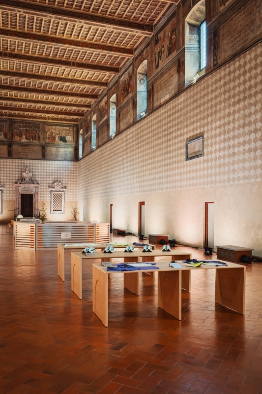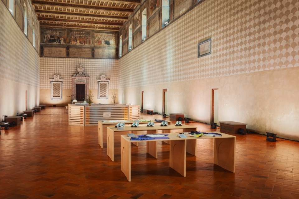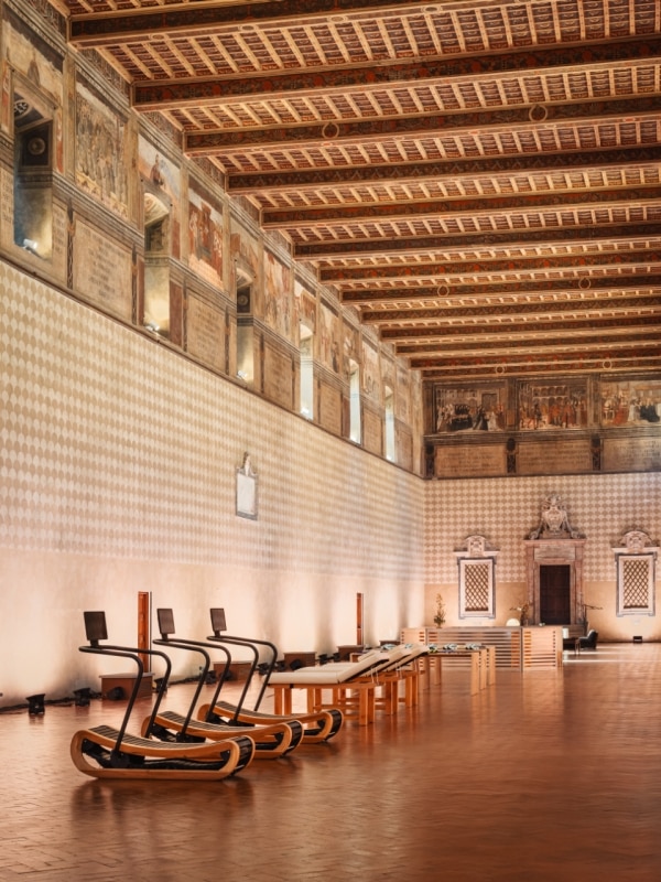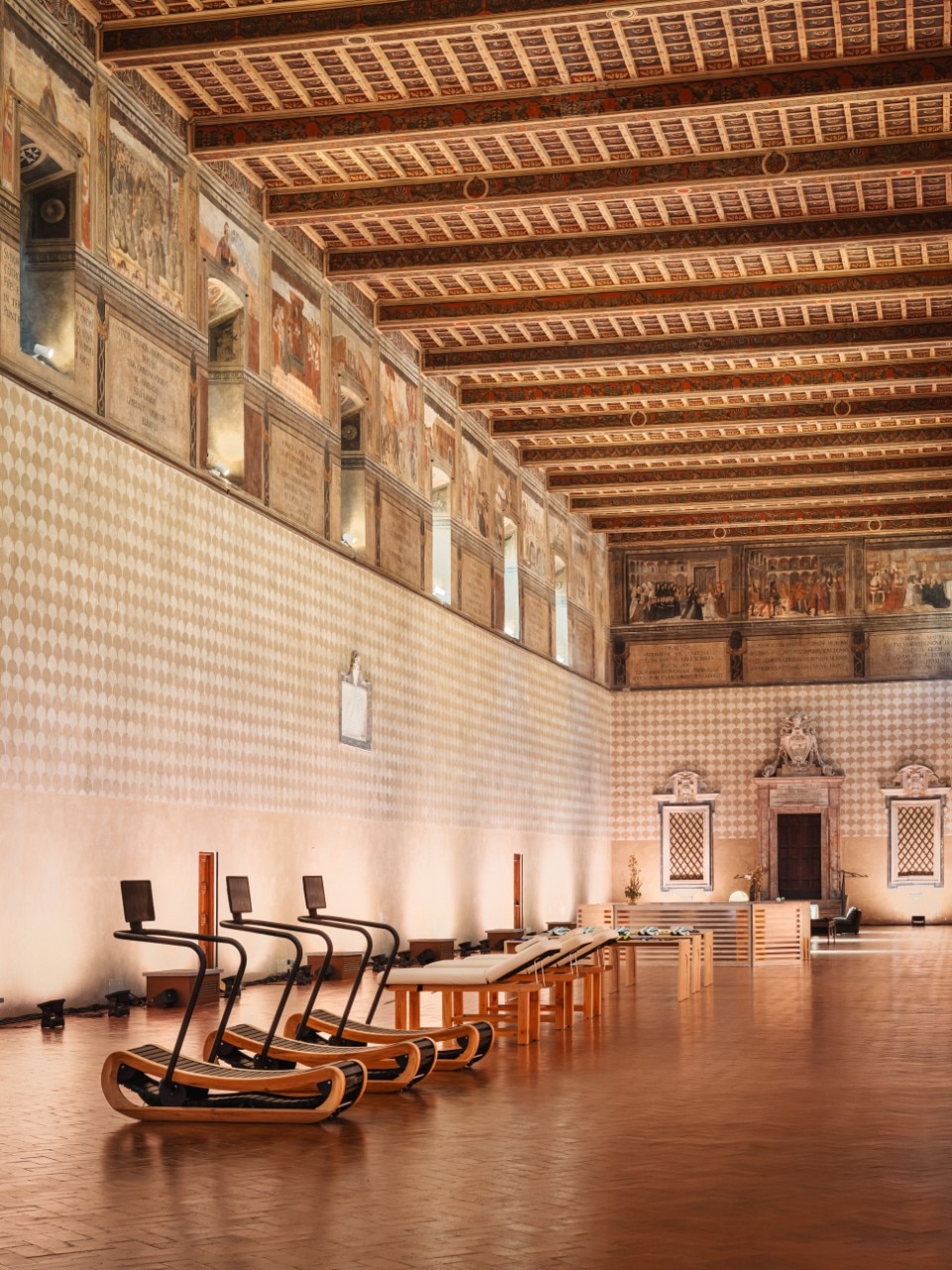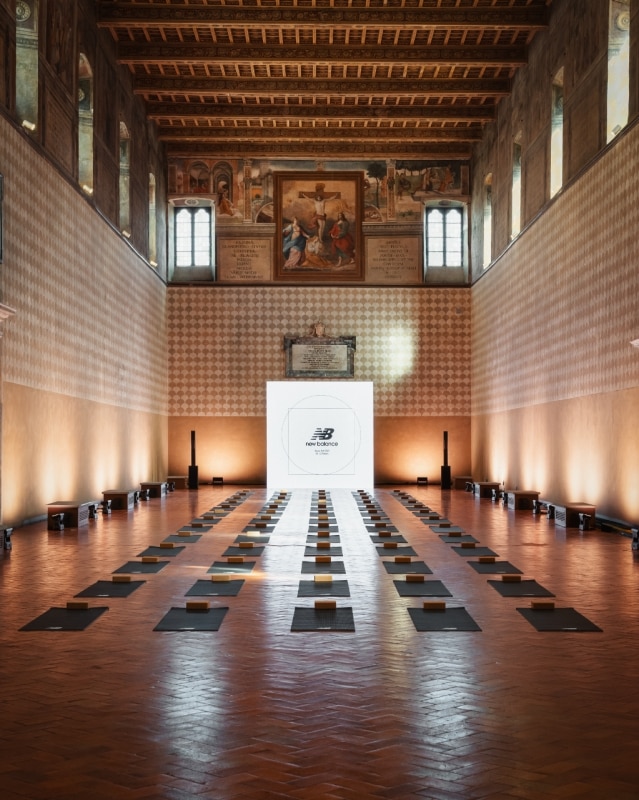 Per tre giorni, lungo i 120 metri della grande navata affrescata, l’architettura quattrocentesca ha accolto un programma ibrido a metà tra centro benessere e piattaforma culturale, offrendo esperienze immersive, workshop e community run. La suddivisione in due ambienti principali — Sala Lancisi e Sala Baglivi — ha consentito di costruire due “dimensioni” differenti, una dalla vocazione quasi contemplativa dedicata alla meditazione, sound bath e breath work, l’altra, invece, orientata al recupero fisico post-maratona. In mezzo, una sequenza quasi installativa di lettini, tapis roulant e nuovi prodotti del brand.