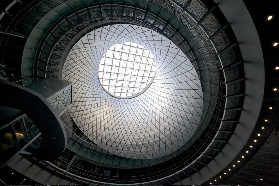 La grazia ariosa di Sky Reflector-Net fa a pugni con il pesante, grezzo rivestimento d’acciaio inox del solaio del mezzanino, con gli analoghi orli d’acciaio dell’atrio che lo circonda e con i chiassosi pannelli segnaletici che vi sono inseriti. Questi elementi del progetto appaiono datati ed eccessivi, forse in conseguenza del fatto che sono stati in origine progettati nel 2003. I percorsi interni non si progettano così. Basta guardare i rendering del recente progetto Crossrail di Grimshaw per la metropolitana di Londra per vedere come lo studio abbia concepito una sinuosa parete bianca a griglia e i pannelli che formano il soffitto in modo da uniformare e addolcire la forma irregolare dei corridoi dell’Underground. Questa soluzione, pazientemente elaborata, non solo propone una modularità che riduce i costi, ma crea anche una sommessa coerenza estetica che favorisce la chiarezza degli itinerari e la segnaletica direzionale.