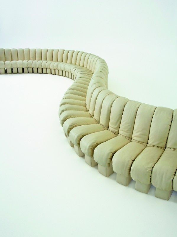 La risposta è nell’anima strutturale stessa di DS-600, riducibile in lunghezza una chiusura lampo di modulo alla volta. Compresi quelli senza schienale. Certo, meno le curve di DS-600 sono flessuose meno ha senso procacciarsene uno, pena la mancata assonanza con il “verme con le zampe” della mitologia alpina cui è associato: il tatzelwurm. In aiuto però arriva la nuova versione da esterno. Da collegare alla sezione che usate in interno tramite porta finestra, purché il piccolo balcone di cui disponete sia generously designed, un’espressione di de Sede per indicare un minimo di metri quadrati in cui farci stare anche un tavolino. Così facendo l’effetto biscione non sarà compromesso. Per tutti gli altri che invece hanno la fortuna di un dehors veramente generoso, staccate pure le due parti. Due mostri alpini sono meglio di uno solo.