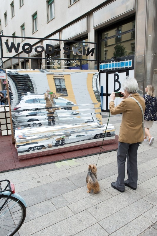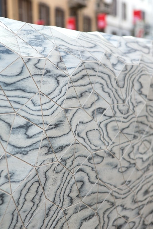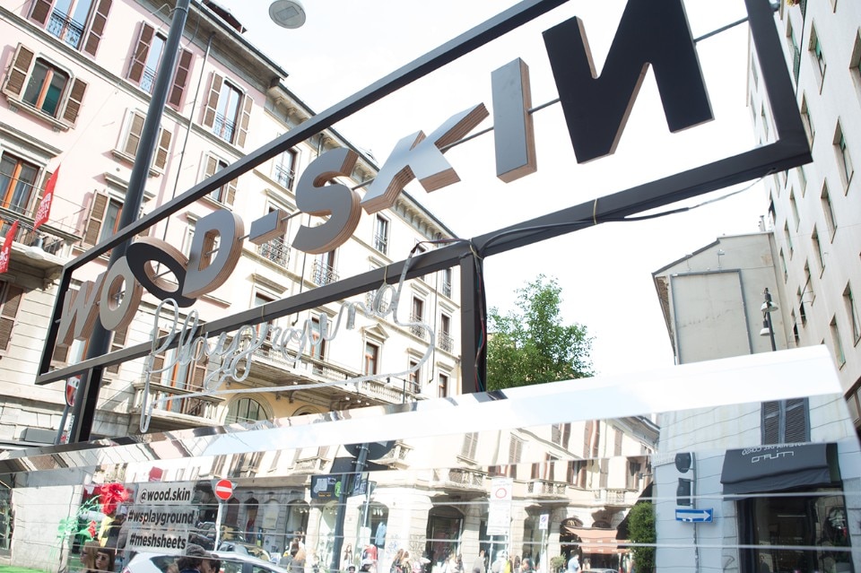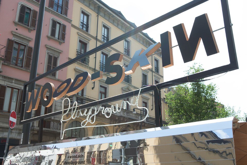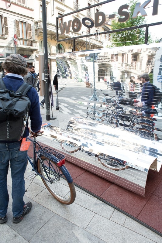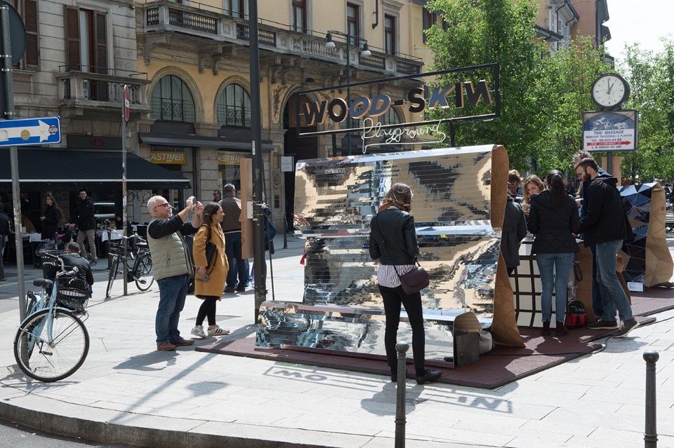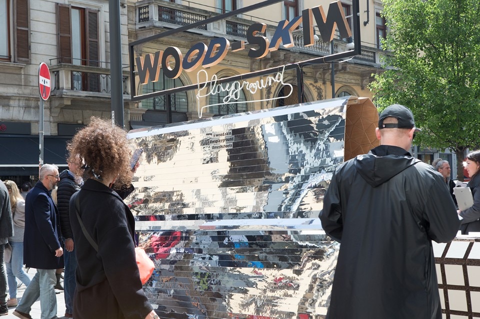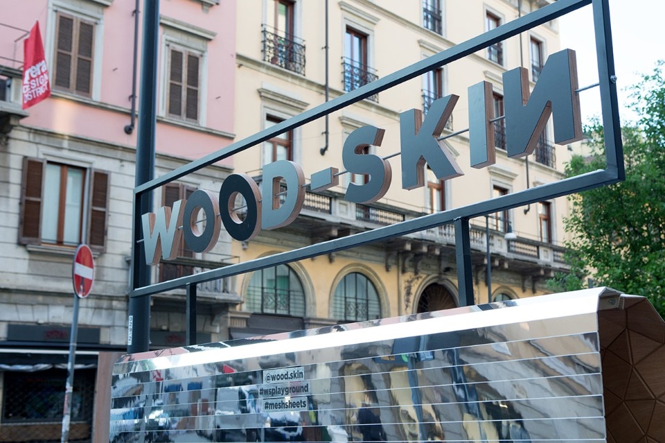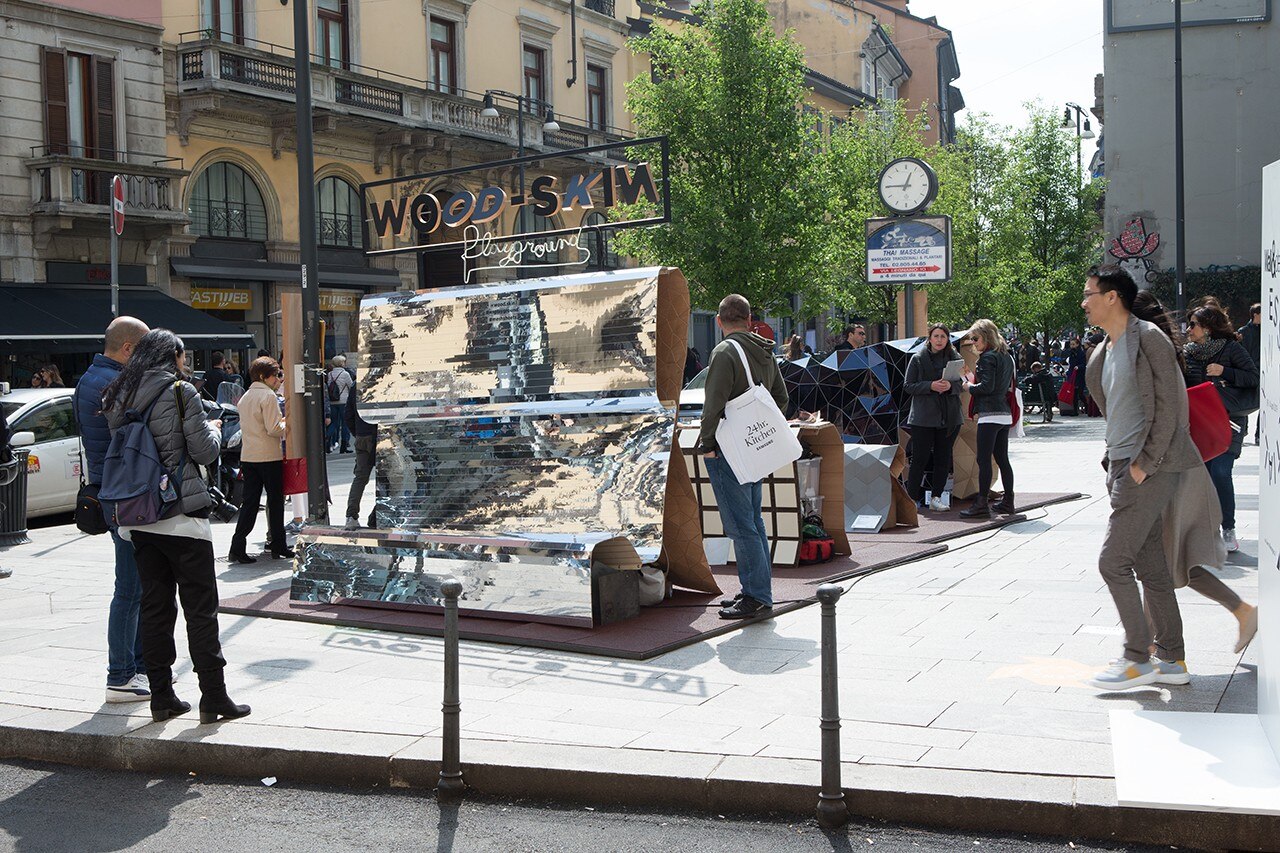 Per il Fuorisalone 2019, Wood-Skin ha presentato un’installazione pubblica che ha trasformato i marciapiedi di corso Garibaldi, a Milano, in una superficie tridimensionale, con fasci di materiali diversi che hanno dato forma a sedute, muri e coperture.