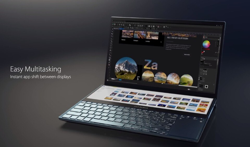 La tastiera è stata spostata più in basso verso il bordo inferiore, mentre il trackpad è finito nell’angolo in basso a destra. Il risultato è una quantità maggiore di spazio utile per le applicazioni, che si può utilizzare in molti modi differenti. I professionisti creativi, ad esempio, possono trasformare il secondo monitor in una dashboard per ospitare funzioni utili al montaggio di un video, al missaggio di una canzone o al ritocco di una foto. Chi scrive può usare il secondo display per visualizzare note, appunti o siti internet. Chi lavora in ufficio magari può sfruttarlo per aprire un secondo file Excel, o meglio un episodio di Game of Thrones mentre lavora a un report richiesto dal capo all’ultimo minuto. Il doppio display è interessante anche per i gamer, che lo possono usare per visualizzare una chat durante una partita in multiplayer, oppure per avere sempre a mano i controlli del livestream su Twitch.