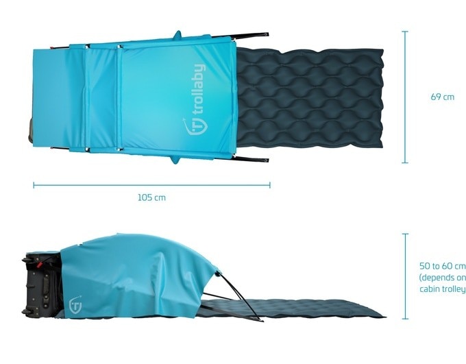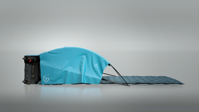 Nel caso siate fermamente intenzionati a rinunciare a ogni vostro diritto, ora c’è il prodotto che fa per voi: si chiama Trollaby ed è un kit pieghevole che trasforma il bagaglio a mano in una tenda da campeggio. Funziona così: si agganciano assieme delle stecche di alluminio e si assicurano alla valigia, poi si dispiega la copertura in plastica e infine ci si rifugia sotto il rifugio di fortuna appena realizzato per sdraiarsi su un materassino ad aria (che va messo in valigia a parte).