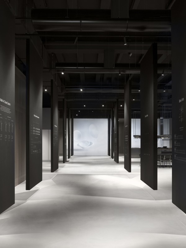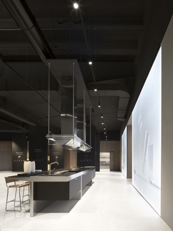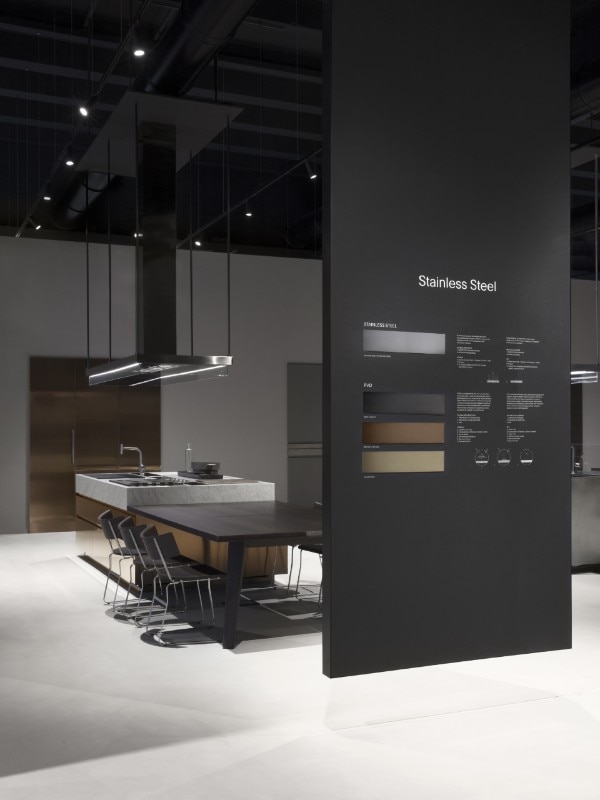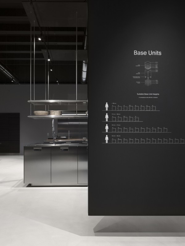 Tra le altre aree dedicate, sorprende in particolare quella riservata al Sistema Modus: due progetti di cucina “a scomparsa” integrale che rispondono a esigenze di divisione dello spazio particolarmente attuale negli spazi compressi dell'abitare contemporaneo, grazie a uno speciale sistema di ante integrato alla boiserie. Anche la grafica illustrativa esce dai comuni modelli dello showroom stereotipato, per avvicinarsi maggiormente al linguaggio dell'allestimento artistico: il racconto di tutti gli elementi-cucina è infatti affidato a grandi pannelli appesi che compongono un vero e proprio percorso sinottico, invitando a un percorso degli occhi e della mente. Anche questa volta: idealmente, senza fine.