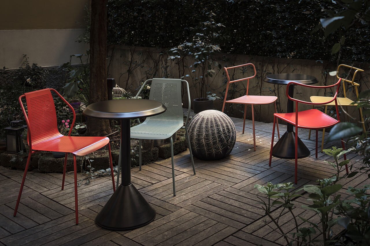 Sedia impilabile firmata Studio Irvine, Donna è realizzata in metallo microforato. “Disegnare questa sedia”, racconta Marialaura Rossiello, “ha significato focalizzare l’approccio progettuale sulla ricerca della leggerezza e della creazione di un sistema capace di adattarsi con disinvoltura a diversi tipi di ambienti e situazioni.