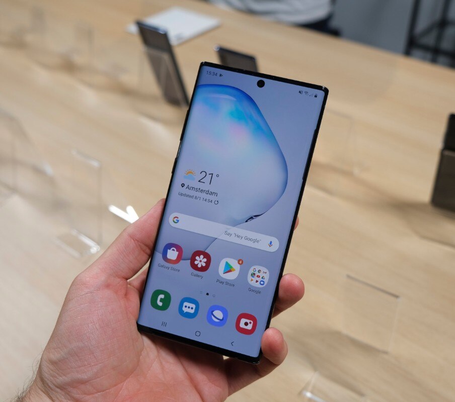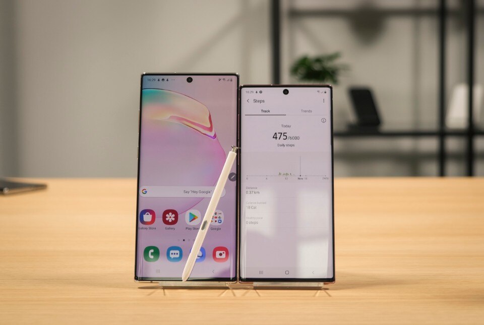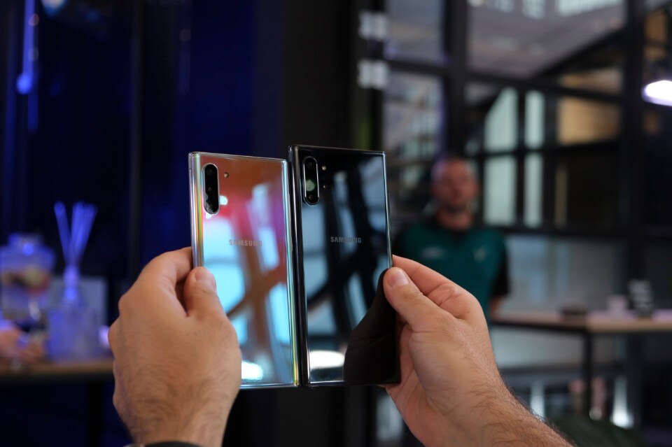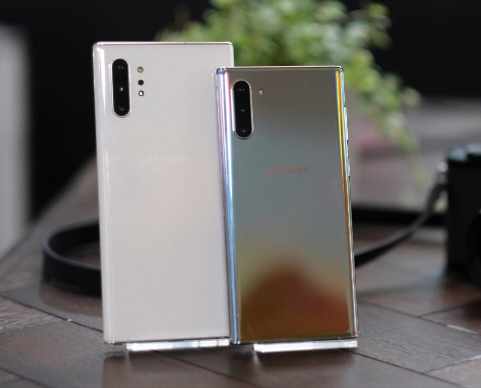 Galaxy Note 10 e Galaxy Note 10+ (i nomi ereditano lo scherma della famiglia Galaxy S) differiscono per alcune caratteristiche chiave. La più ovvia è la dimensione dello schermo: 6,3” su Note 10, 6,8” su Note 10+, che offre anche una risoluzione superiore QHD. La tripla fotocamera sul retro è la stessa eccezion fatta per il sensore ToF del Note 10+, un obiettivo aggiuntivo utilizzato semplicemente per migliorare il rilevamento della profondità. Anche le configurazioni di memoria RAM e spazio di archiviazione sono differenti: il modello più piccolo arriva al massimo a 256GB di memoria flash con 8GB di RAM, mentre sulla versione “plus” si parte da 12GB di RAM e lo spazio di archiviazione parte da 256GB ma può raddoppiare a 512GB. La memoria interna si può espandere solo su Note 10+, mentre sul modello più piccolo non è presente il lettore di schede microSD.
