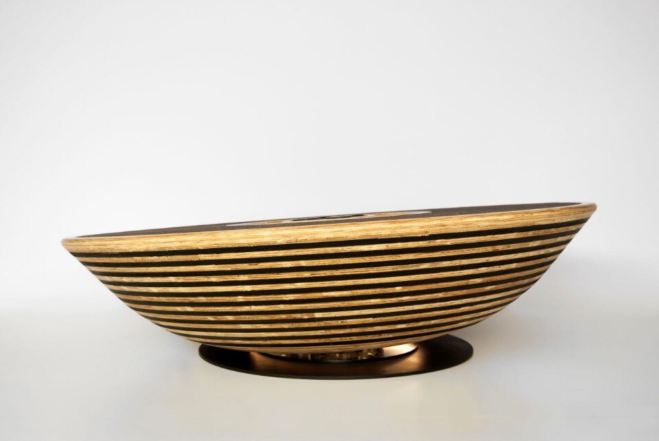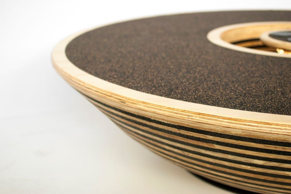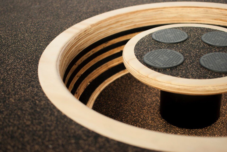 La seduta, progettata dall’interior designer Elisa De Berti, si basa sul concetto della condivisione. Con 1,90 m di diametro, la panchina a effetto basculante – posata su una testa a snodo – rimane in equilibrio solo se più persone prendono posto, invitandole al dialogo e ad una continua interazione. Questa seduta-trottola può reggere fino a 20 tonnellate ed è realizzata con la gomma riciclata di pneumatici e legno stratificato. Al centro, prese usb, caricatori wireless e QR code.