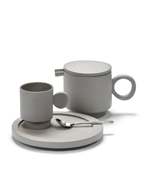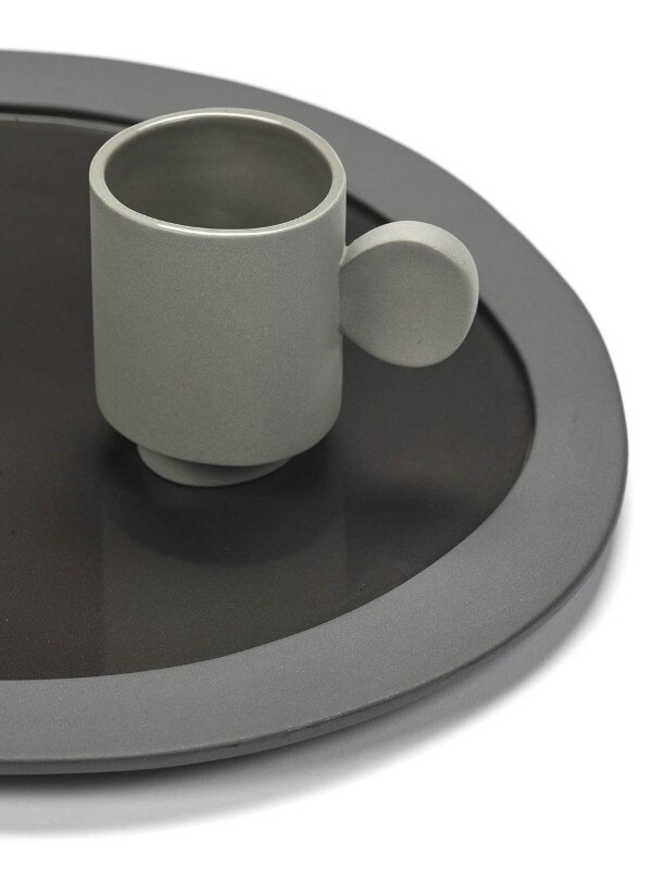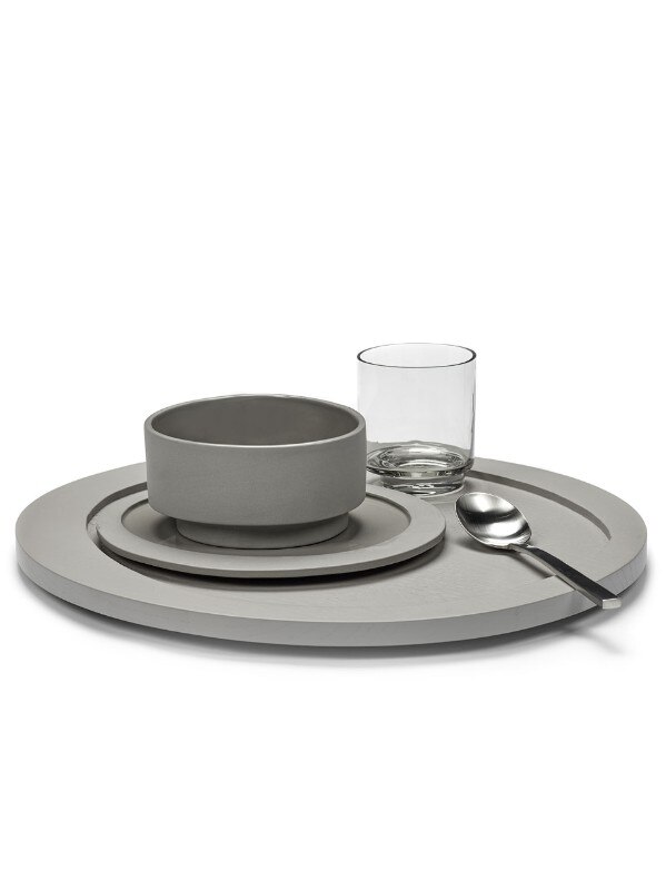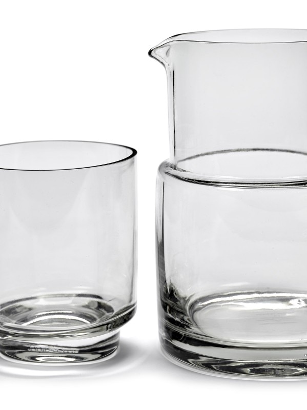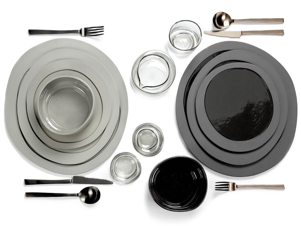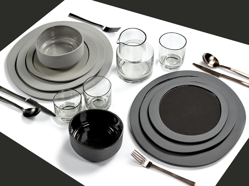 Oltre che dall’accidentata asimmetria, i piatti sono caratterizzati da colori non colori declinati sulla scala di grigio, mentre i bicchieri, anch’essi leggermente asimmetrici, fanno della trasparenza un contrasto voluto. Le novità, lanciate lo scorso gennaio, vanno ad integrare i complementi già prodotti in precedenza per il marchio belga: un servizio di posate e un imponente macina pepe che, al pari di una torre in miniatura, sembra bonariamente scrutare l’intera tavola.