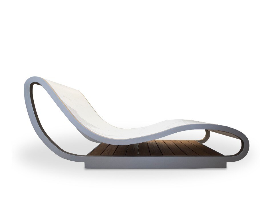 Disegnata da Franco Gemignani e Natascia Bascherini per Sa.Ge.Van Marmi, la chaise longue Vellum è caratterizzata da forme morbide e appare, nell’insieme, leggera. Materiali naturali vengono uniti formando un lieve contrasto: la seduta di marmo Statuario di Carrara, di soli 4 centimetri, è sorretta dalla base più scura di teak.