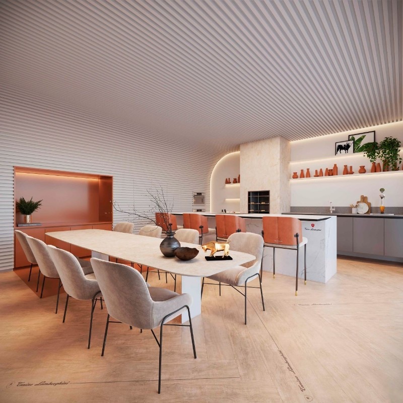 L’edificio alto 170 metri avrà un totale di 53 piani e una superficie di 25.000 mq e 67 unità, includendo spa, area relax, palestra, piscina e un’area bambini. Attraverso linee fluide e curve, il progetto —che vede Falvio Schiavon come responsabile del design esterno — vuole esprimere l’identità Lamborghini diventando un punto di riferimento nel settore immobiliare del lusso. Gli interni, di cui è responsabile Vanessa Larré, seguiranno la stessa idea: la hall sarà caratterizzata da curve nel soffitto a doppia altezza e gli arredi saranno firmati Tonino Lamborghini Casa. Terrazze con viste sul paesaggio completano gli appartamenti.