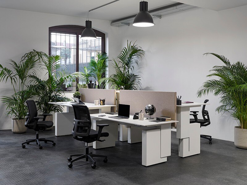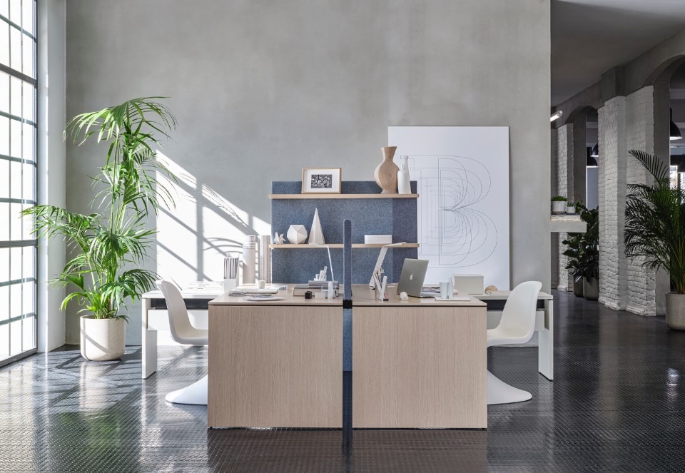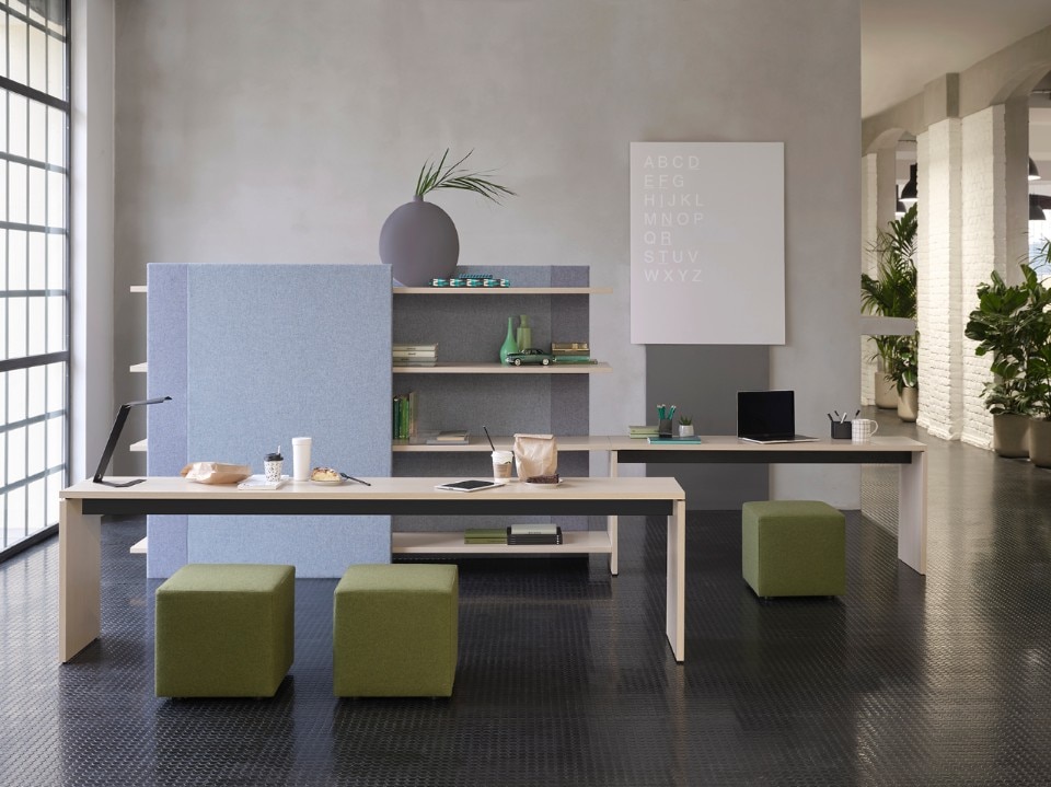 Bridge include Reception, una panca strutturale dotata anche di schermi frontali per una maggiore sicurezza sanitaria; Workstation, la postazione disponibile con gambe metalliche o pannellate; Adjustable Desk, composto di un piano elevabile meccanicamente. Si aggiungono inoltre i tavoli riunione Meeting nelle tre forme rettangolare, quadrata e tonda; Lounge, panca per il relax dotata di schermi acustici o sanitari, e Storage, contenitori e librerie acustiche.