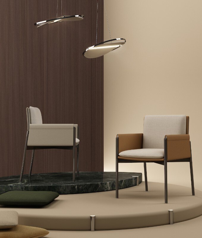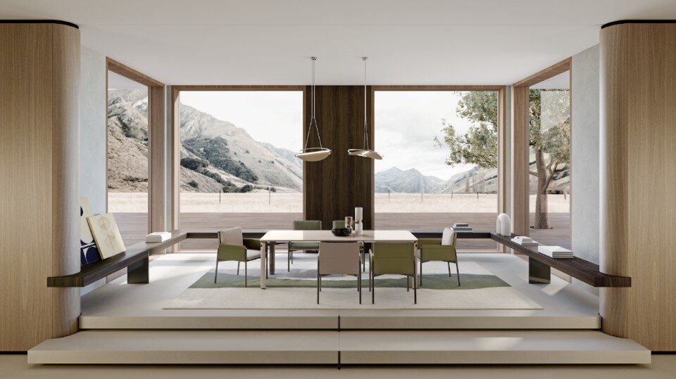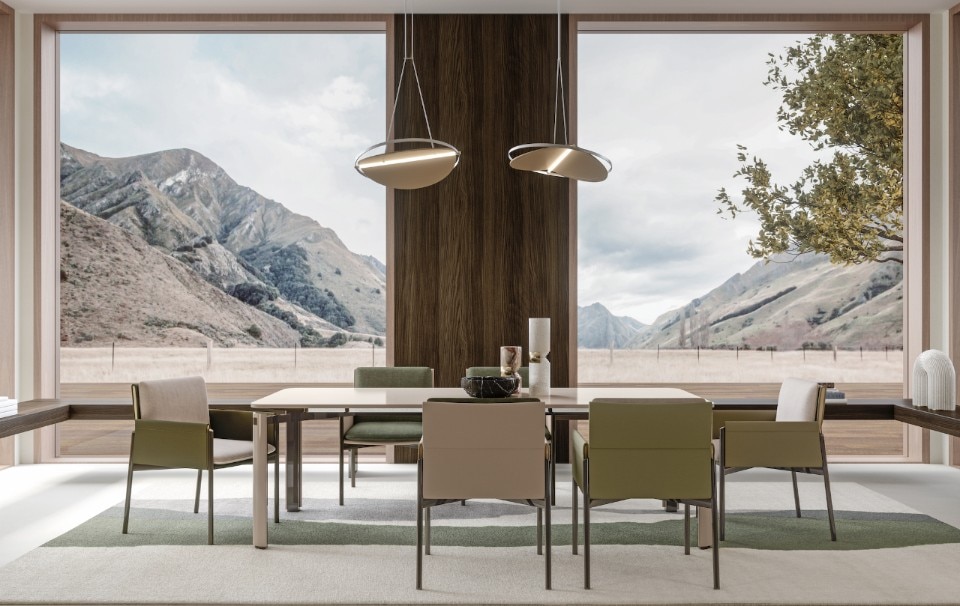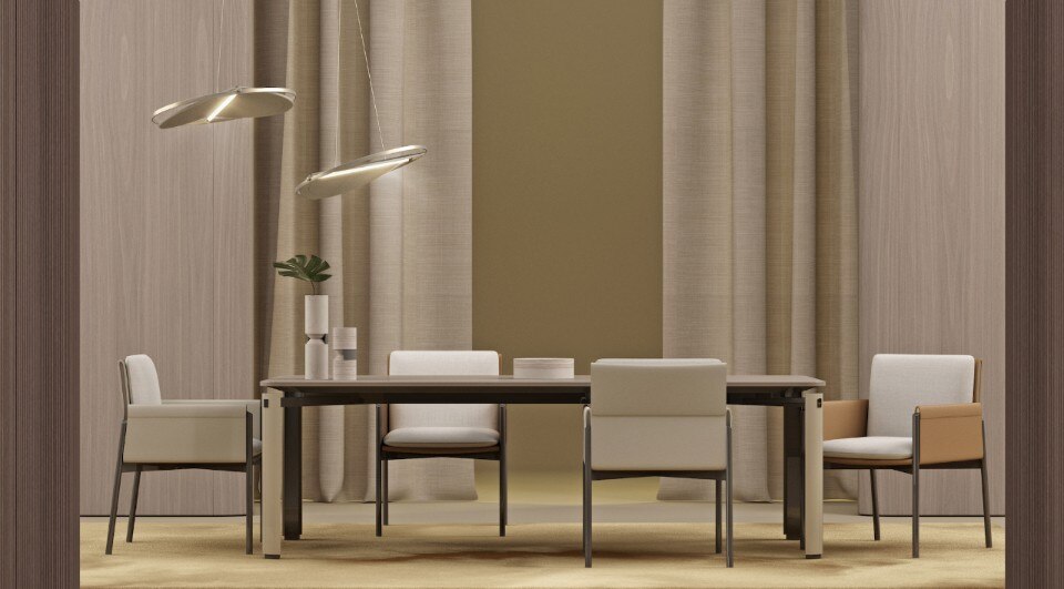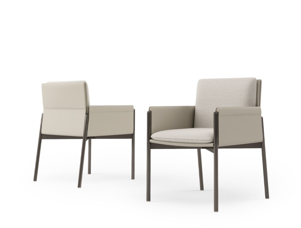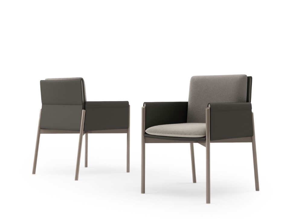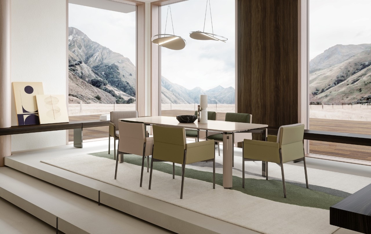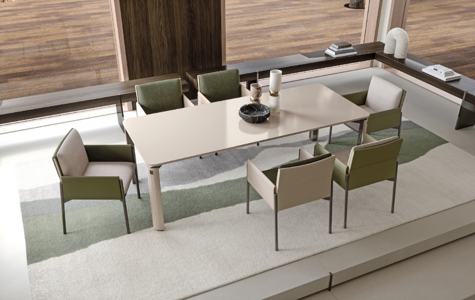 Anche la sovrapposizione di piani è elemento caratterizzante di tutta la collezione, evidente sopratutto nei dettagli degli elementi contenitivi. Ma, in realtà, è la sospensione l’ideale sintesi di tutta la collezione, evidente nella sottile base delle sedie e nelle gambe del tavolo, entrambe in metallo laccato.