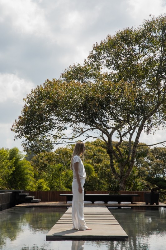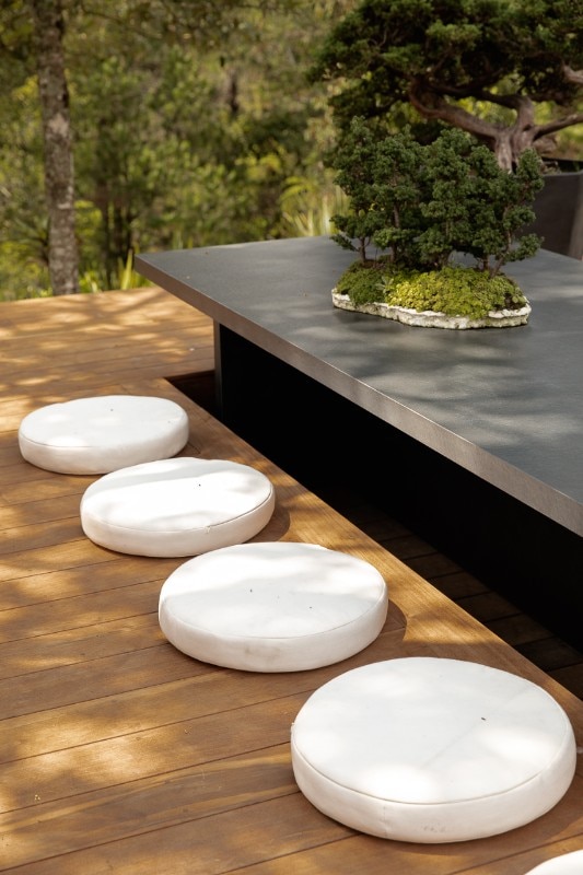 Quest’ultimo è utilizzato anche per il caminetto esterno, punto focale del giardino e simbolo dell’elemento fuoco. A completare lo spazio all’aperto, una piscina semi-olimpionica e uno specchio d’acqua con sentiero per la meditazione.
