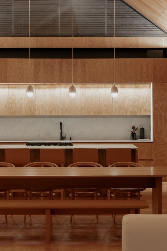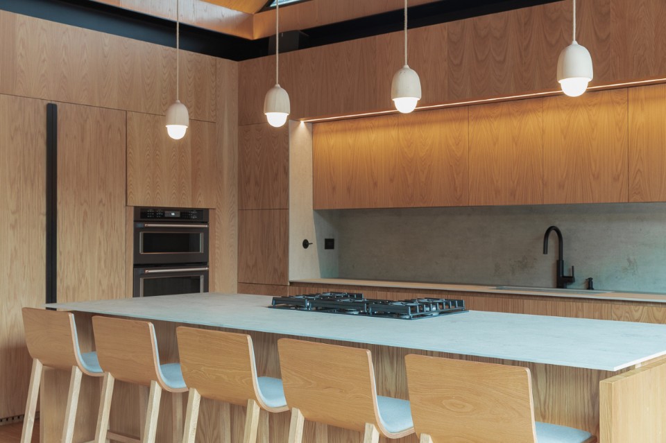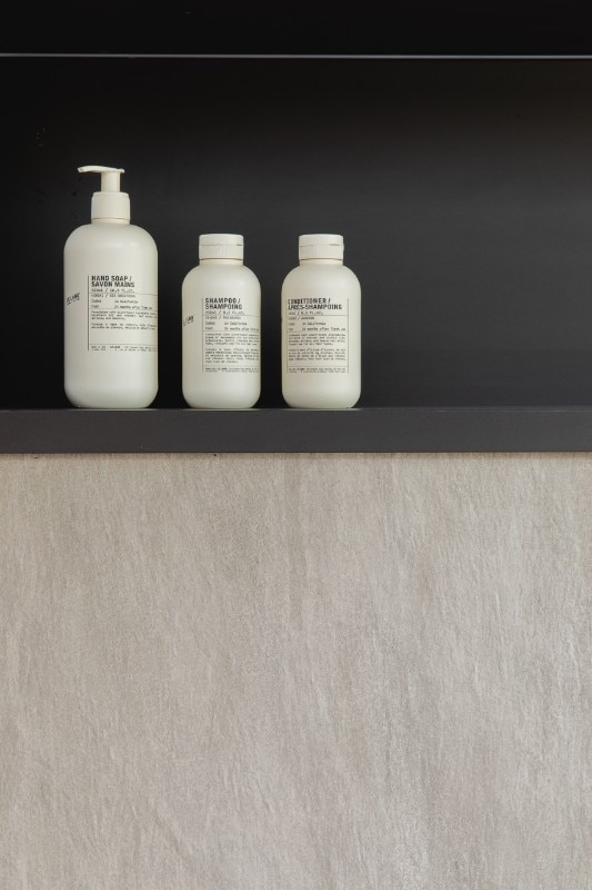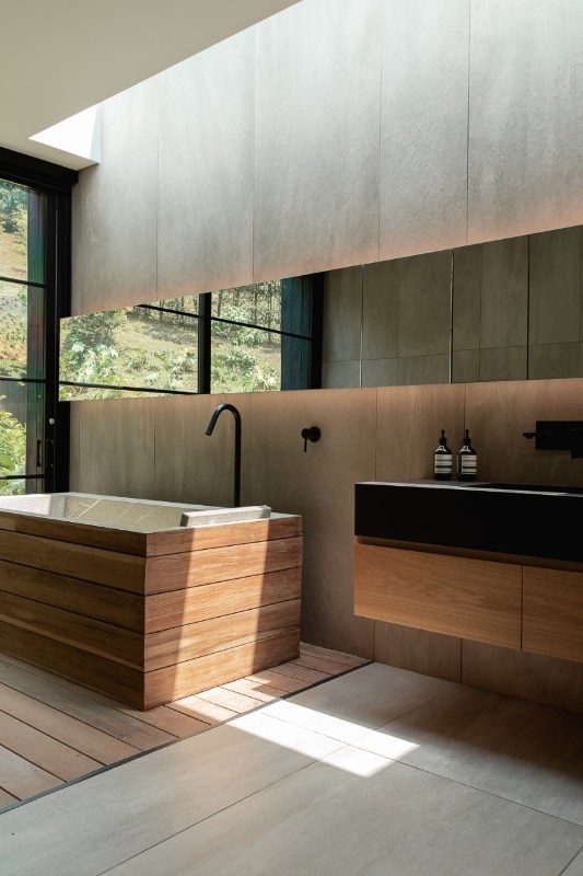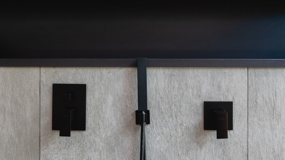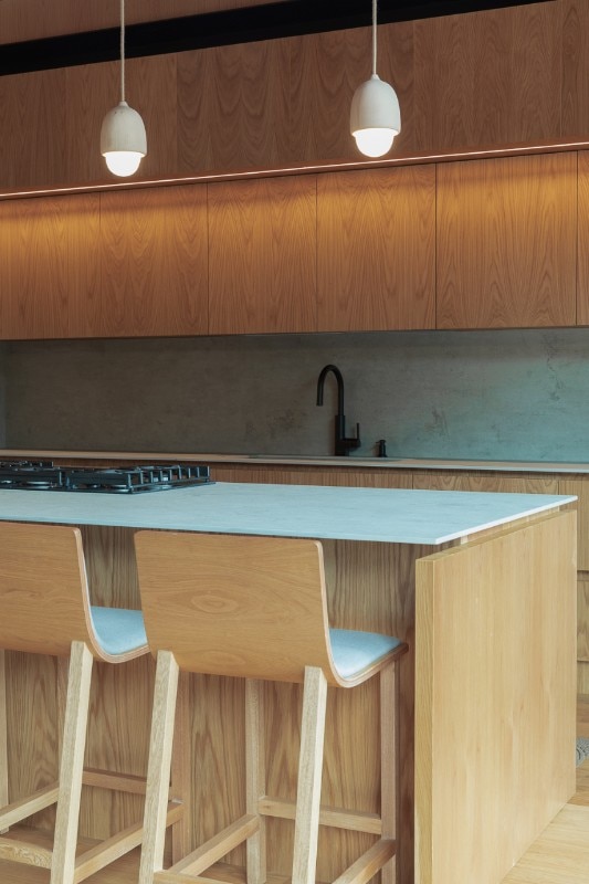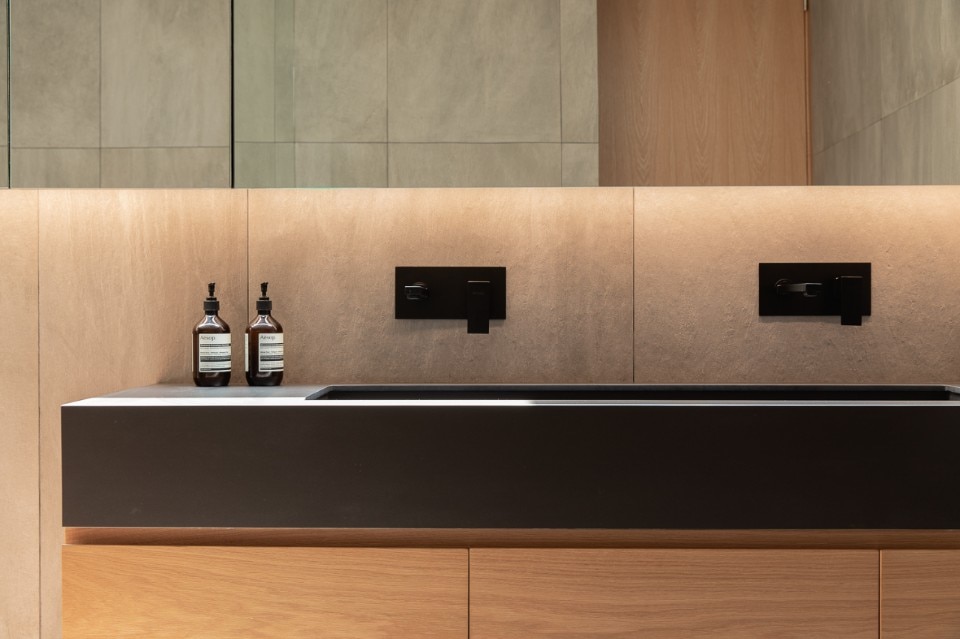 Nei bagni del padiglione privato, i soprapiani sono rivestiti con Neolith Nero, in contrasto con il legno naturale. Il padiglione sociale – che comprende cucina, sala da pranzo e soggiorno – inserisce ripiani e paraspruzzi in Neolith Beton, superficie ispirata al cemento gettato.