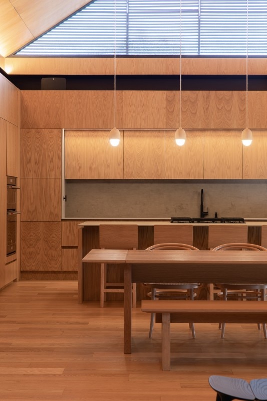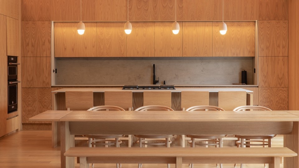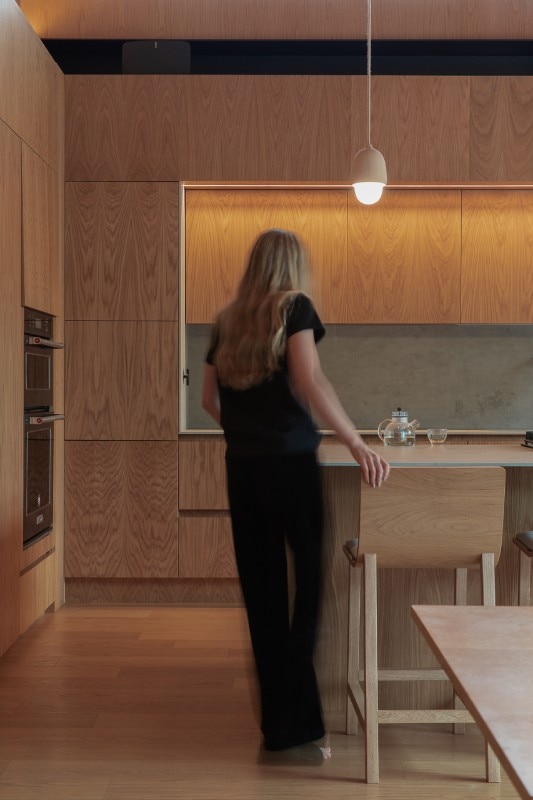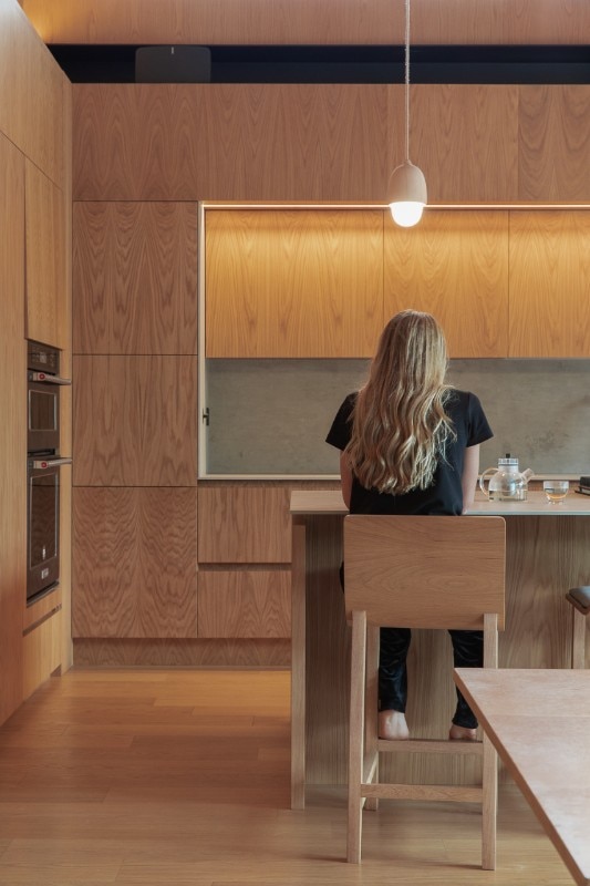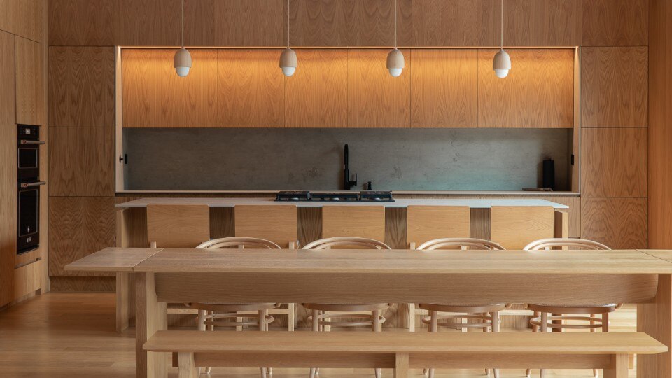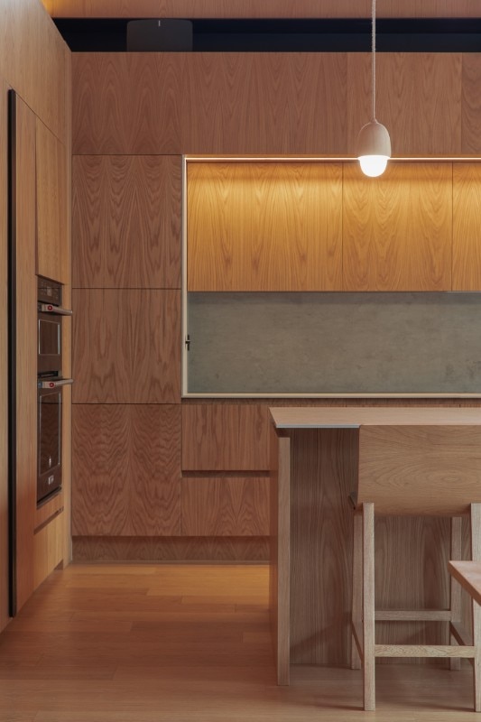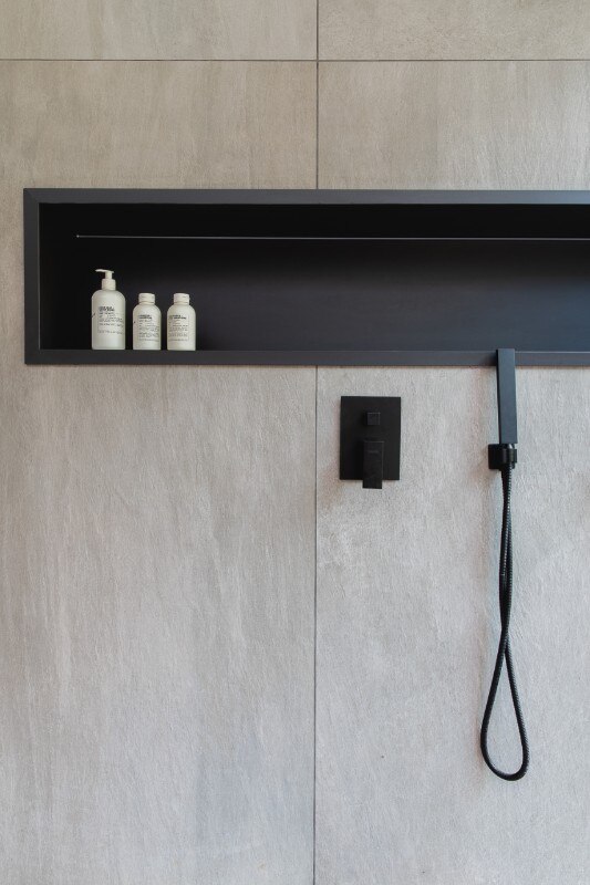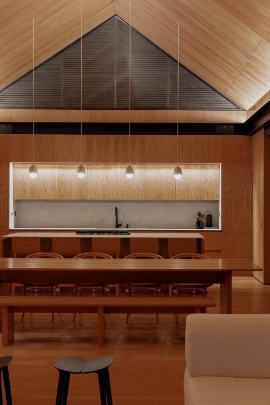 Nei bagni del padiglione privato, i soprapiani sono rivestiti con Neolith Nero, in contrasto con il legno naturale. Il padiglione sociale – che comprende cucina, sala da pranzo e soggiorno – inserisce ripiani e paraspruzzi in Neolith Beton, superficie ispirata al cemento gettato.