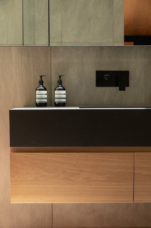 Considerando la stretta relazione tra la casa e la natura, i designer hanno selezionato i rivestimenti Neolith – marchio specializzato nella Pietra Sinterizzata – che riproducono la pietra naturale: sono stati applicati in bagni, cucine e spazi all’aperto grazie alla loro resistenza e durabilità; la loro superficie a bassa impronta di carbonio, inoltre, è in linea con l’idea di sostenibilità ambientale del progetto.