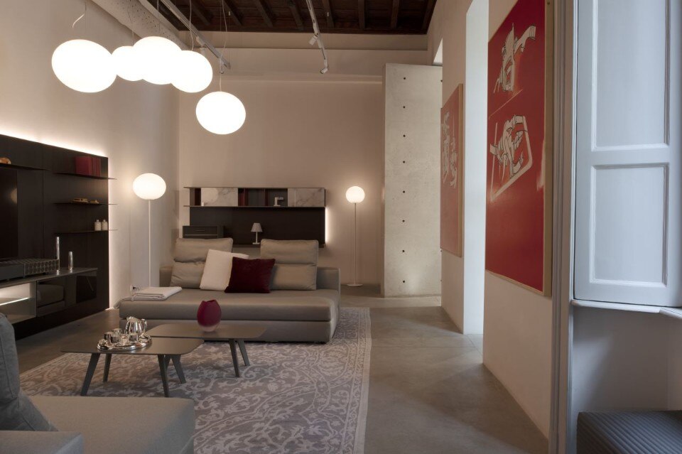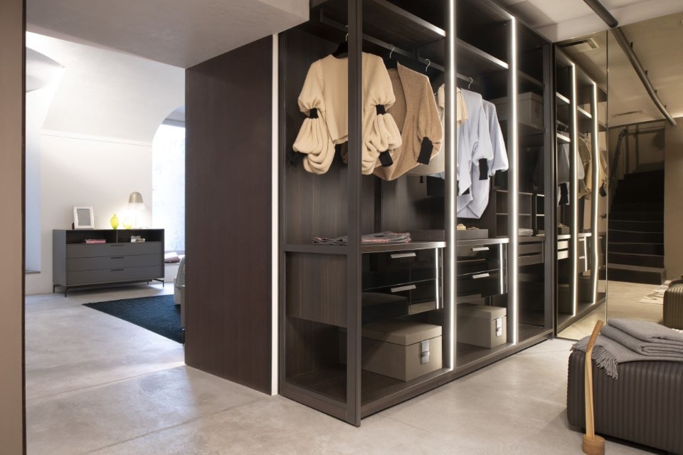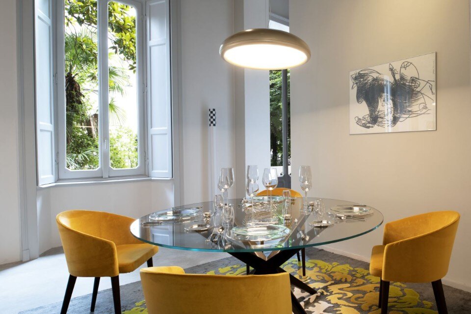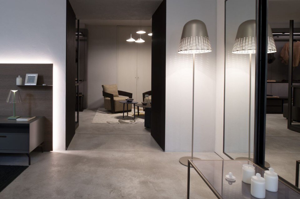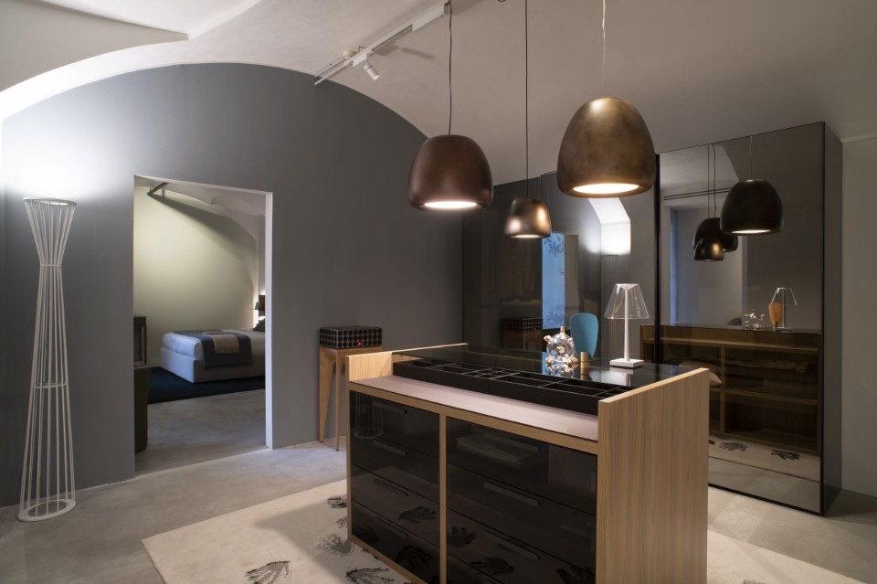 L’allestimento curato dallo Studio Lucchesedesign è suddiviso in più zone, ciascuna destinata ad una funzione abitativa diversa: dall’area welcome dell’ingresso a quella dining e sharing, dove si trova la parete di Ando e un tavolo per il meeting; il piano interrato è dedicato alla zona relax, con arredi per la casa e il contract, e alle aree guardaroba e notte.