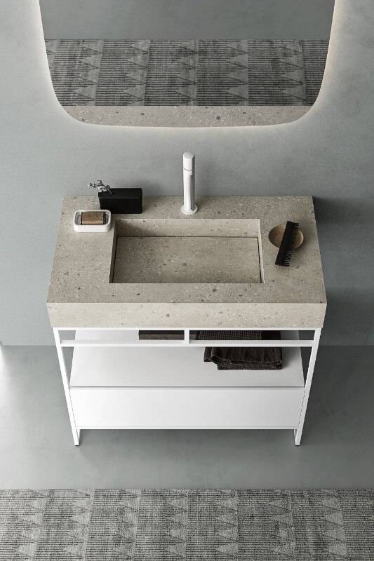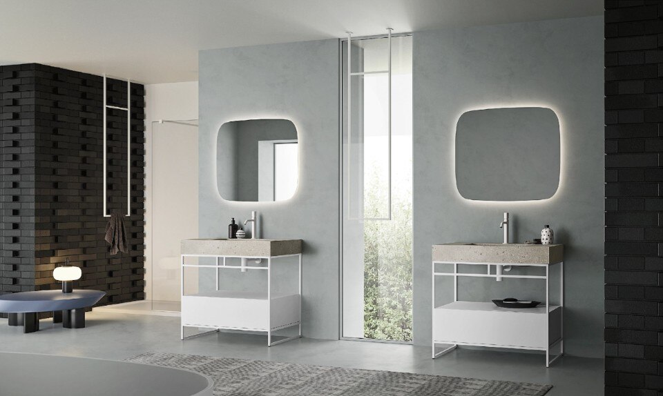Teso è una proposta inedita capace, attraverso la modularità e versatilità dei suoi elementi, di cogliere e soddisfare, in una dimensione assolutamente equilibrata, il mood di chi lo abita: mobili sospesi o a terra abbinabili a strutture monoblocco in alluminio, piani folding, lavabi in appoggio o integrati nei piani, consolle, pensili, elementi a giorno e specchiere.
