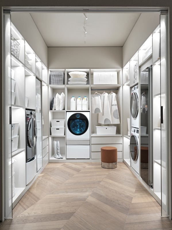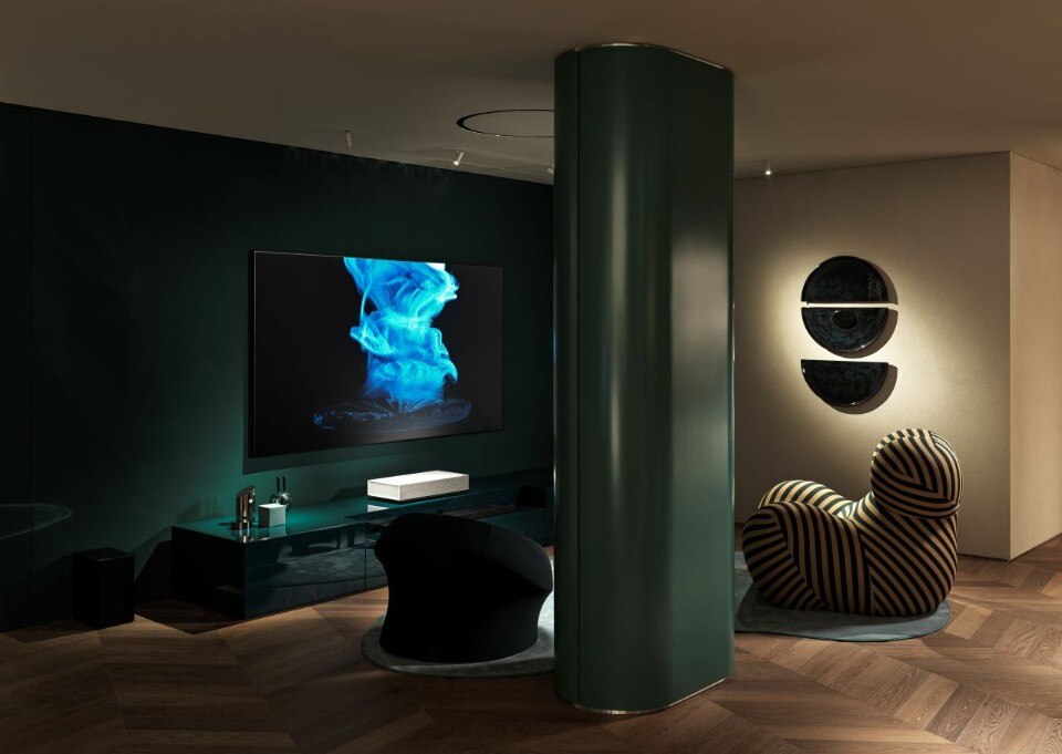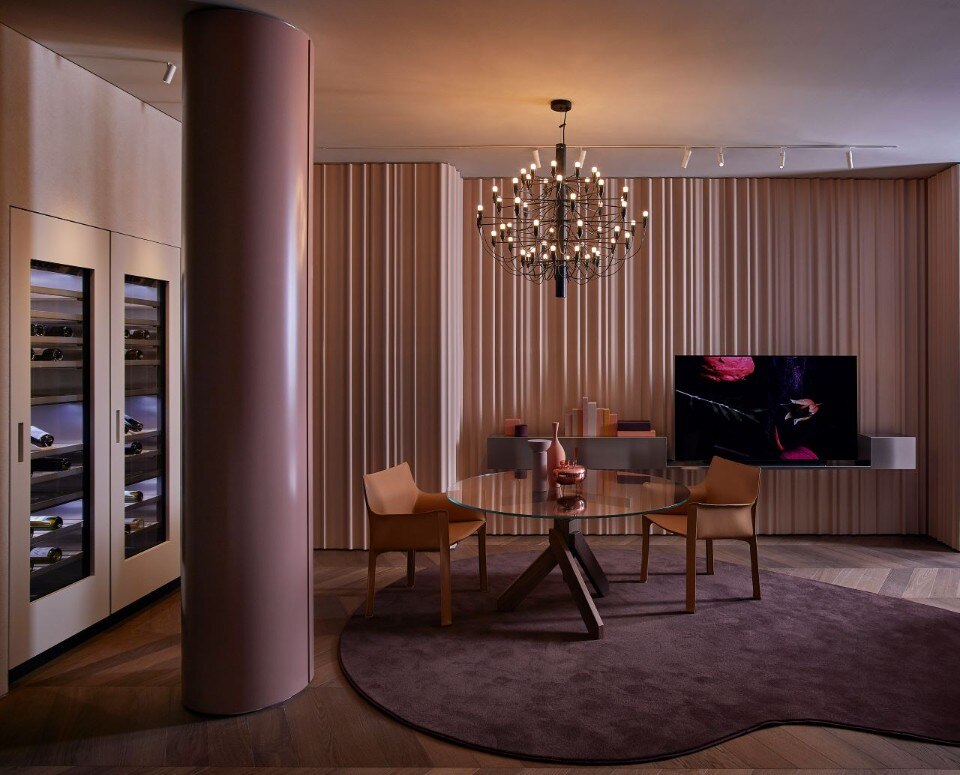 Qui una grande area è dedicata alle attività di showcooking e una scala a chiocciola conduce al piano inferiore, destinato al True to Smart: una sorta di scenografia teatrale con aree divise cromaticamente. Ambiente smart perché qui sono esposti altri prodotti dei brand del gruppo, da LG Signature e LG Objet, a LG ThinQ, insieme ai pezzi iconici di Castiglioni, Albini, Mangiarotti e Caccia Dominioni. Infine, il mezzanino ospita la Food Academy pensata per i corsi di cucina tenuti dallo chef Andrea Vigna.