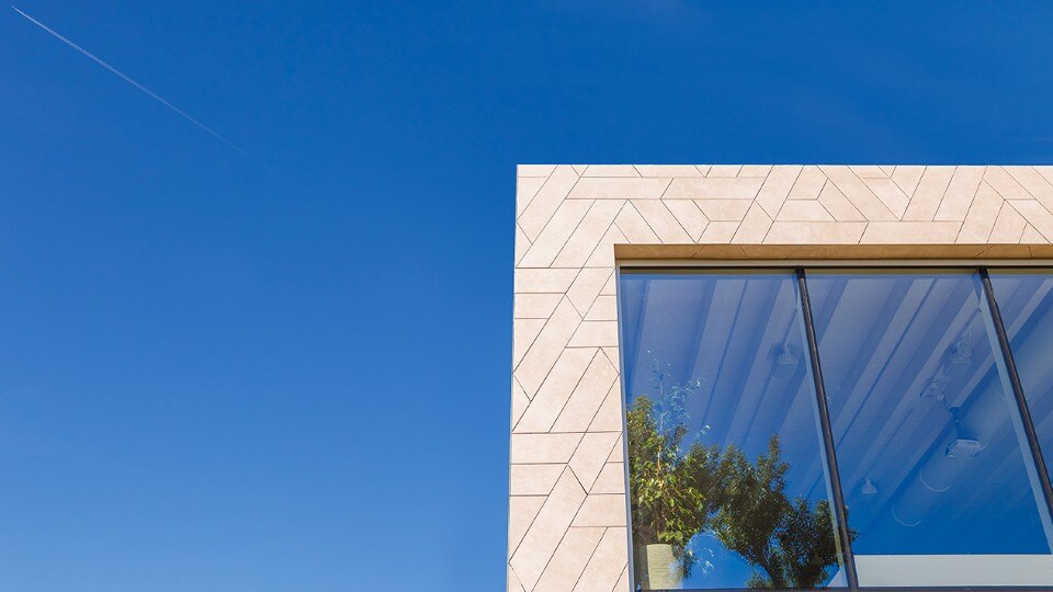 Lo studio pisano interviene sul blocco più recente creando una facciata dalle linee geometriche ispirata ai principi di Adolf Loos e che Porcelaingres interpreta con la collezione Urban Great Sand. Le lastre in gres della serie, di 6 mm di spessore, rimandano alla matericità del cemento e sono state realizzate su misura con taglio a idrogetto.