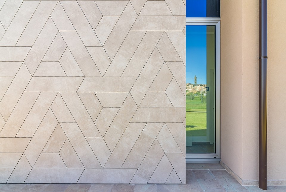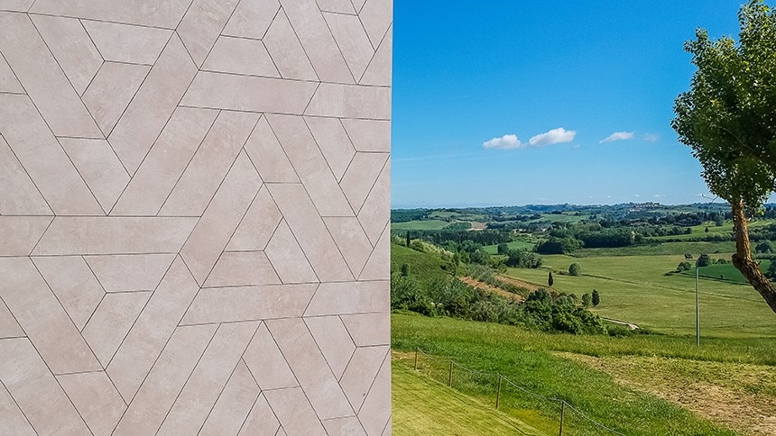 La nuova facciata ventilata della biblioteca si intregra nel paesaggio circostante grazie alle lastre di colore sabbia, prodotte dall’azienda in impianti a emissione zero che riutilizzano gli scarti.
