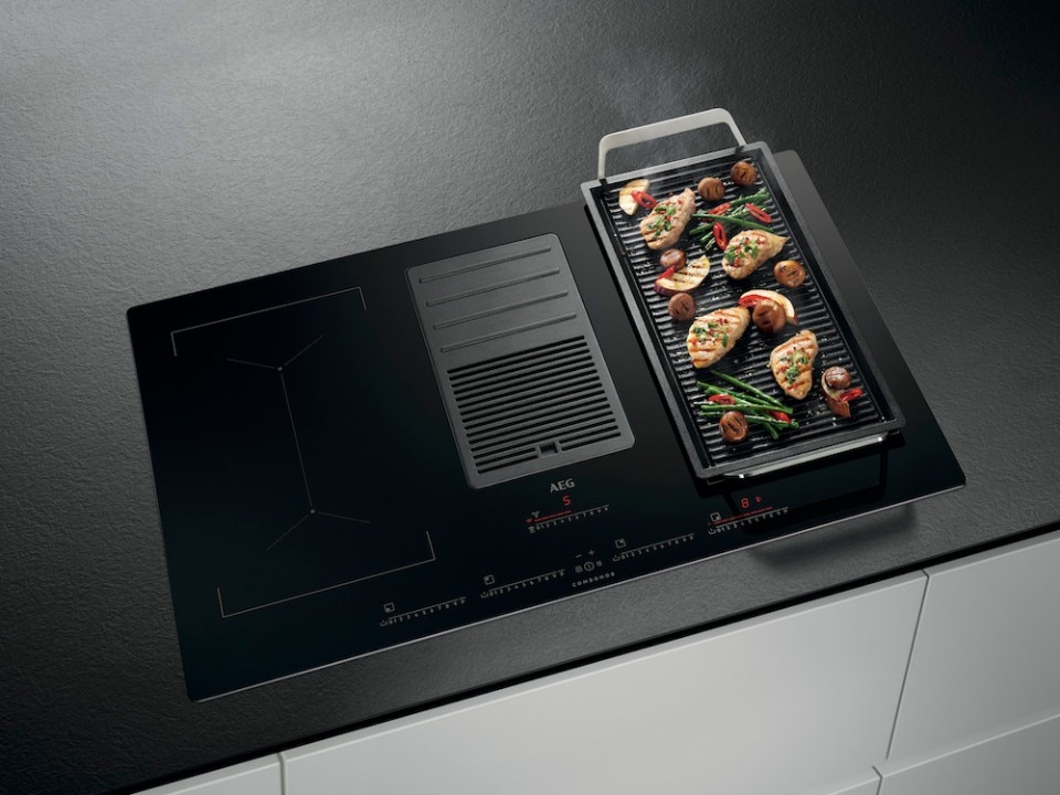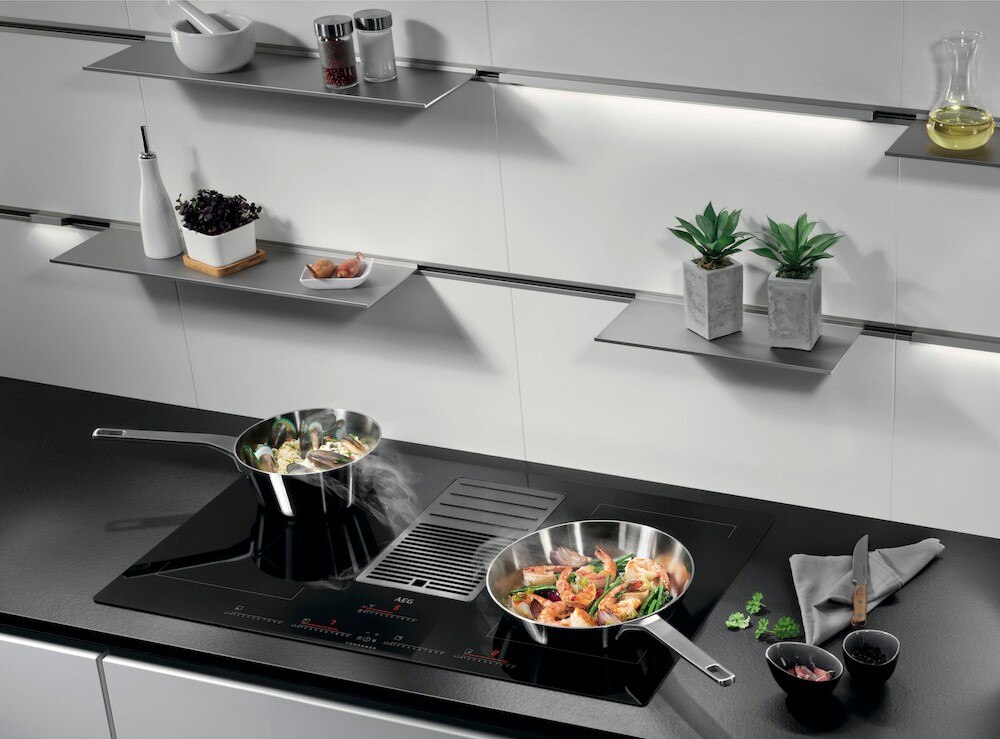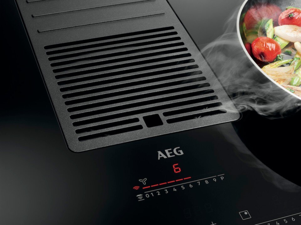AEG presenta Combohob, piano a induzione con cappa integrata definito da una superficie nera che si accende con il controllo elettronico Direct Touch. Il piano si caratterizza per le alte performance di cottura e di aspirazione, pulendo l’aria silenziosamente: la ventola della cappa si trova dietro una griglia nera ed è disponibile nelle versioni aspirante e filtrante.