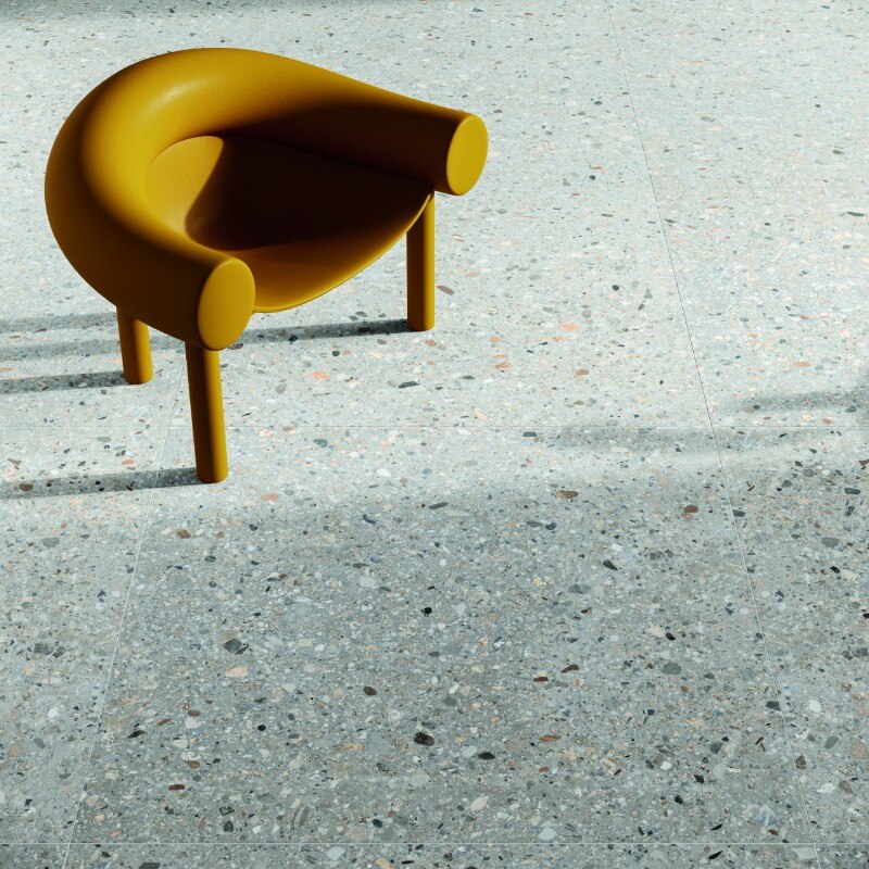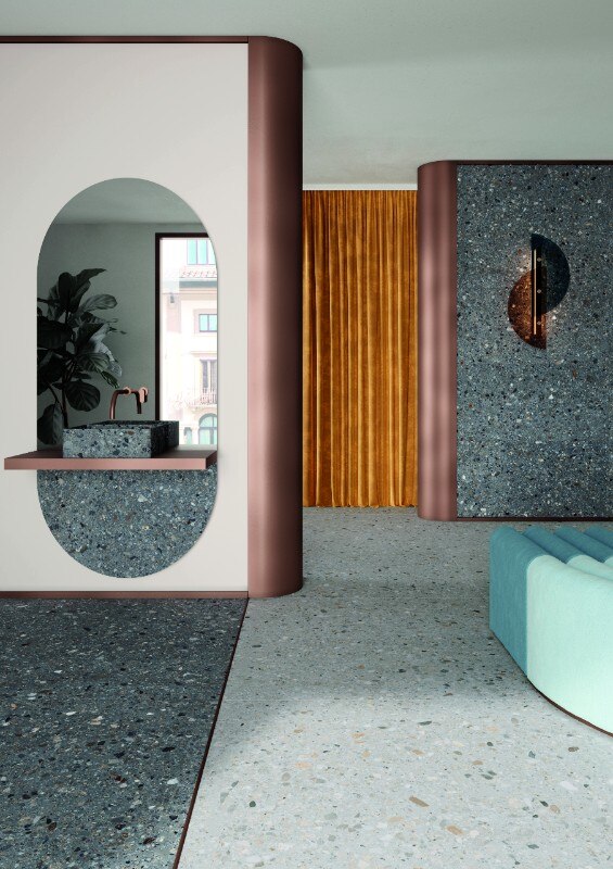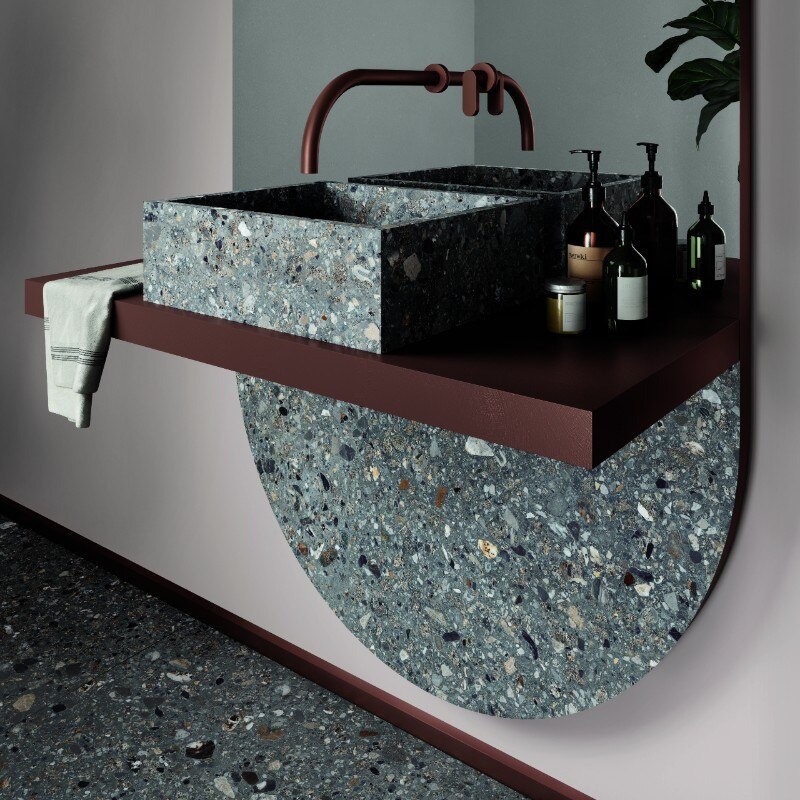 La combinazione di fondi calcarei e innesti minerali crea tre diverse tonalità e finiture, Grey, Dark e Light, in cui sono ben visibili i ciottoli colorati e gli elementi marmorei in una composizione vivace ed equilibrata.