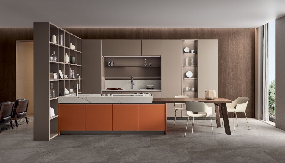 Lounge, proponendosi di rendere l’ambiente cucina più funzionale, si caratterizza per i volumi più ampi e la maggior capacità contenitiva di basi e colonne. Tra le finiture disponibili, ci sono i legni pregiati, i laminati Fenix®, i laccati lucidi, opachi e in finitura metallo liquido.