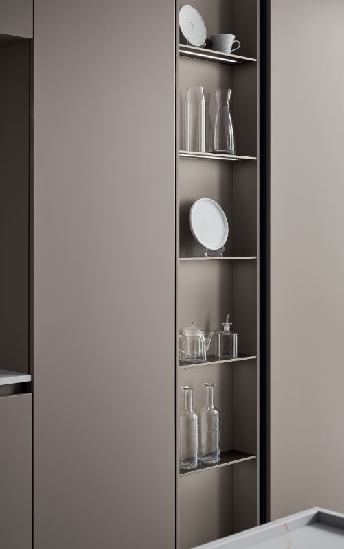 Un secondo lavello, collocato all’interno della nicchia che si viene a creare tra le ante, rende maggiormente fruibile l’ambiente: lo spazio raccolto della nicchia rompe il ritmo verticale degli arredi ed è rivestito da una boiserie con telaio in alluminio. La nicchia, con il piano in Caranto Quartz Libra, può essere inoltre completata con binari per l’aggancio di mensole e luci.