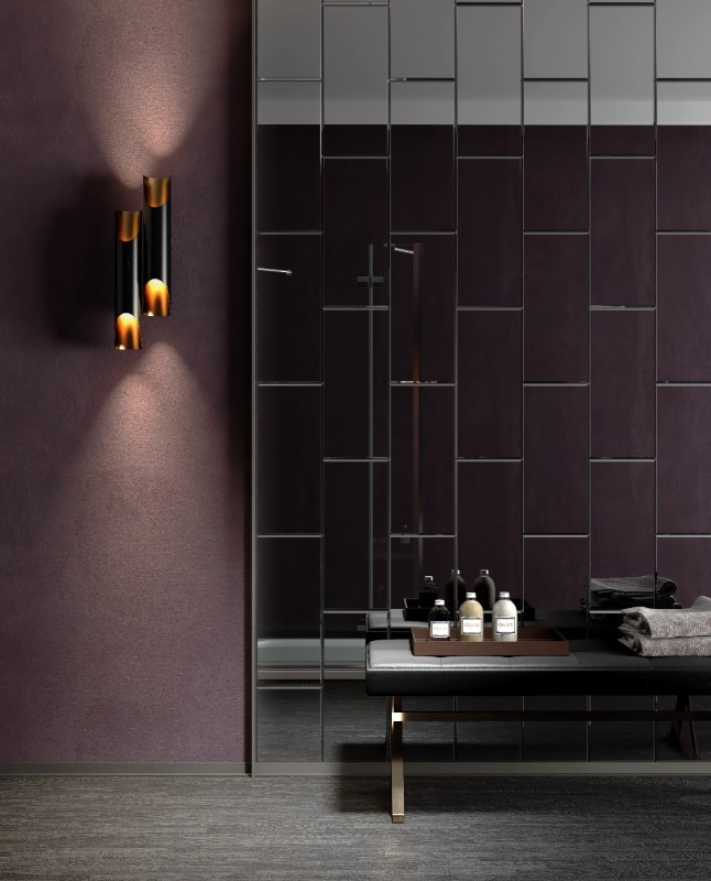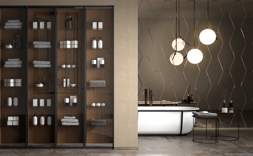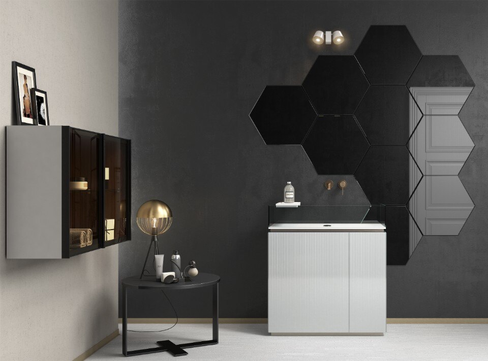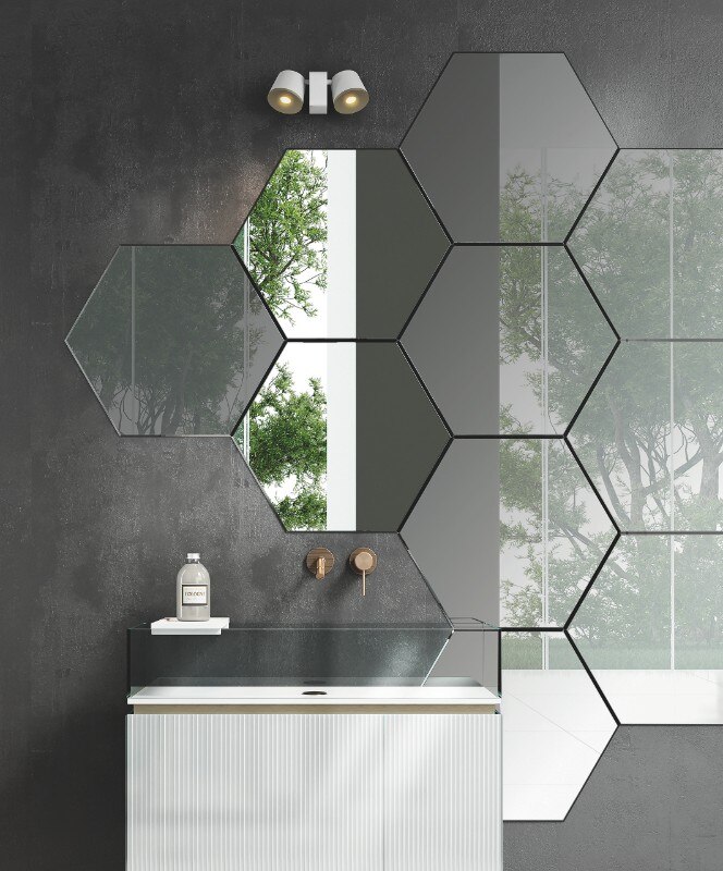 Forme geometriche come rettangolo, esagono e losanghe definiscono i componenti, disponibili nelle finiture fumé grigio, fumé bronzo e specchio. Predisposti per l’incollaggio a parete, questi elementi possono essere combinati liberamente oppure installati secondo uno schema predefinito.