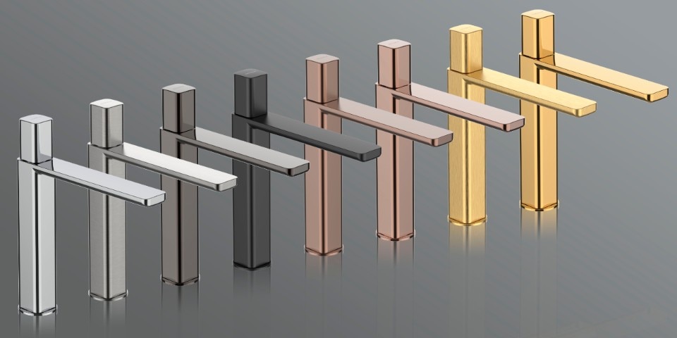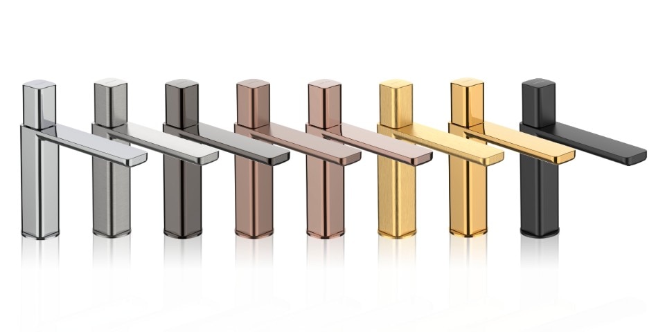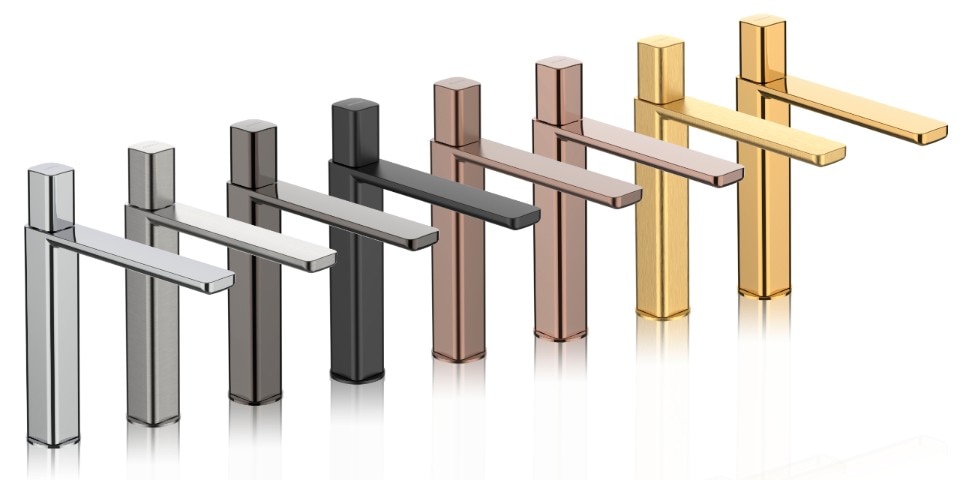 I miscelatori sono disponibili in 8 diverse finiture: Cromo, Nichel Spazzolato, Oro, Oro Spazzolato, Nero Opaco, PVD Rame, PVD Rame Satinato, PVD Nichel Nero.