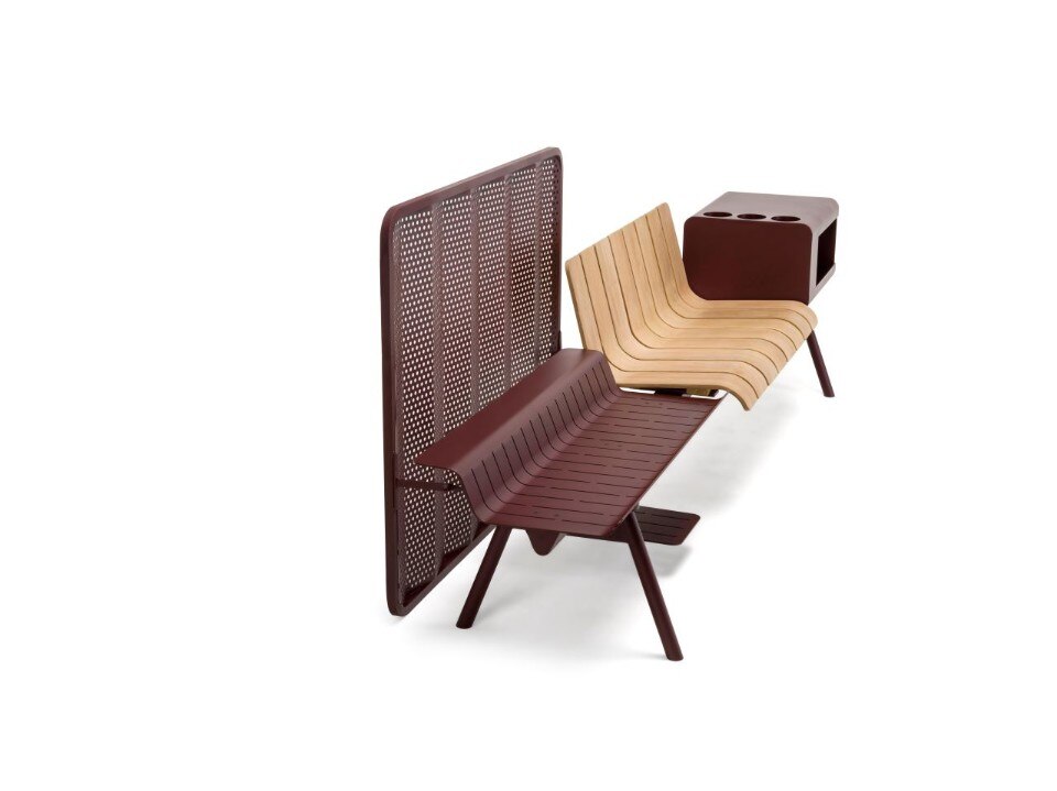 Per le forme curve e modellate sono stati utilizzati materiali sostenibili e resistenti, come il teak naturale certificato FSC e l’alluminio, disponibile in Black Red, il Moss Green il Sepia Black.