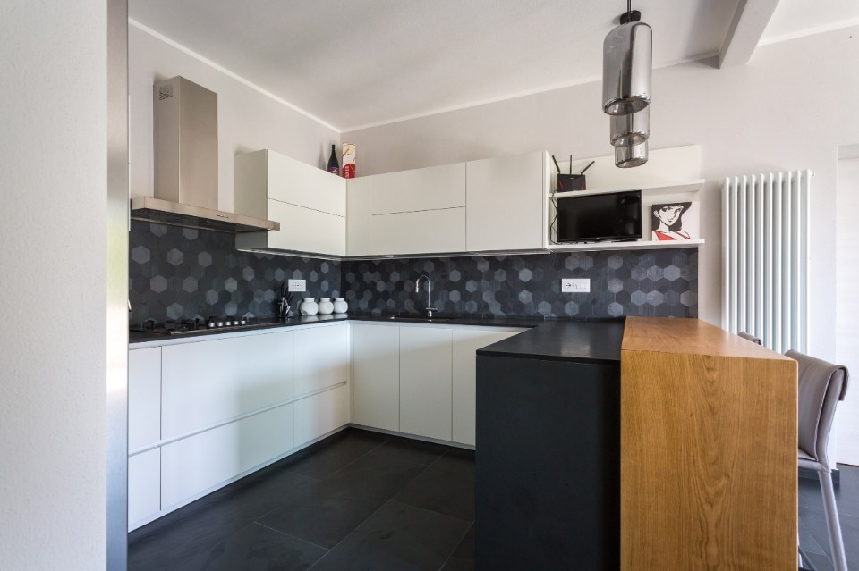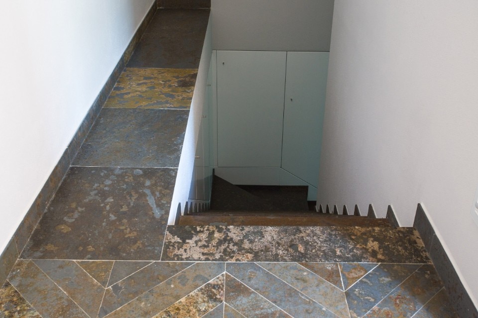 Sono diversi gli elementi della villa in ardesia: il pavimento di cucina e soggiorno, il piano cucina rivestito con la collezione naturArdesia®, i top dei tavolini del living, le pareti dei bagni e il lavabo, la scala interna – in versione Multicolor – e gli spazi outdoor, terrazzo e accesso al garage.