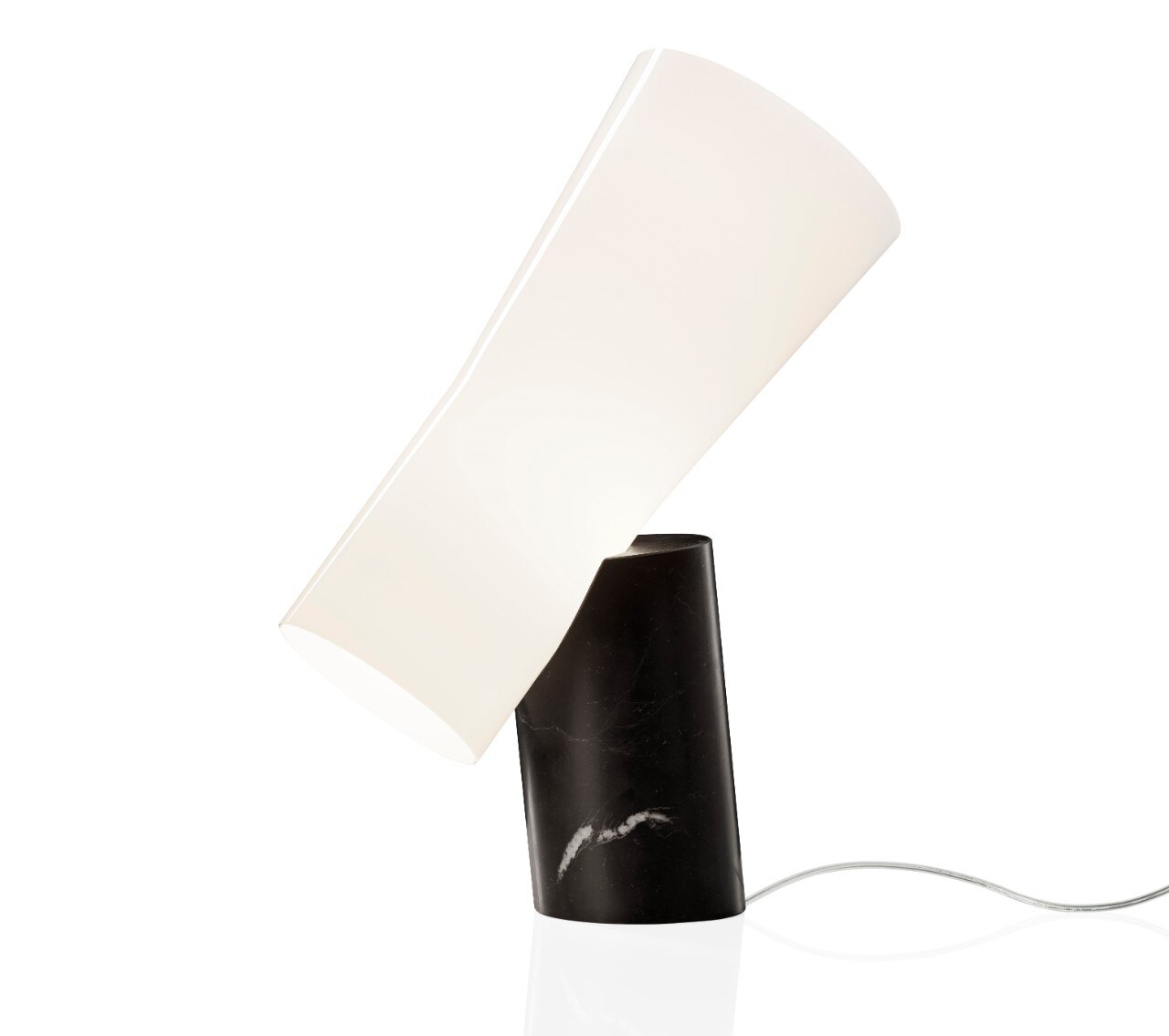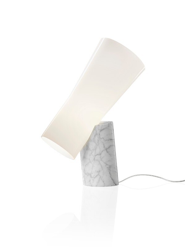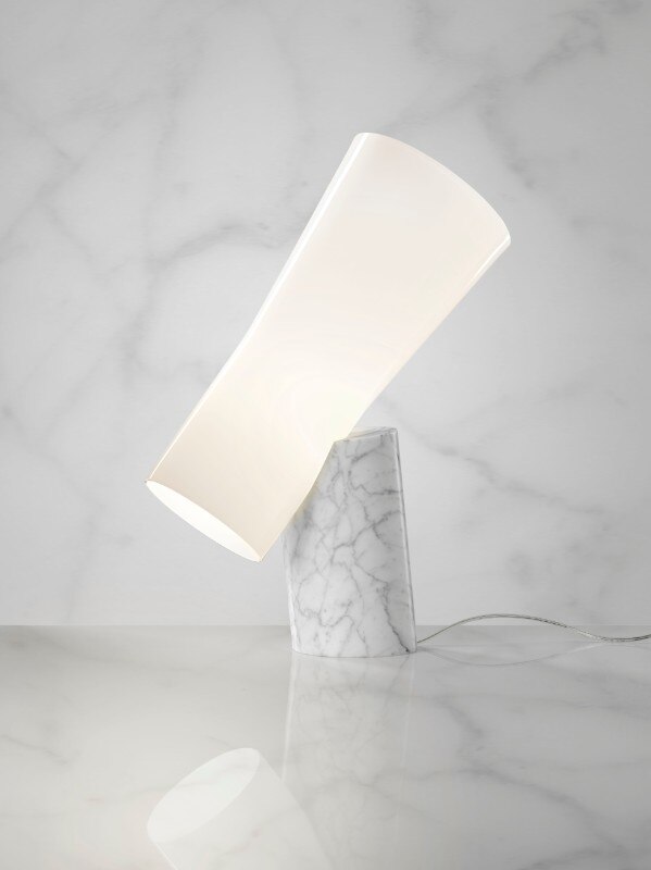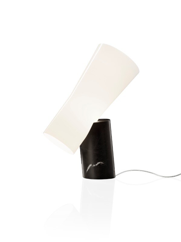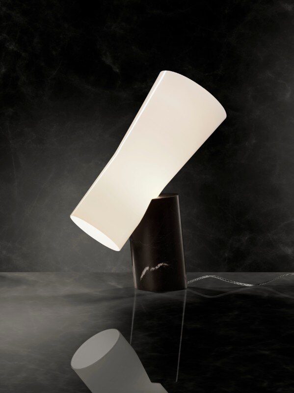 Su una base cilindrica in marmo resta in equilibrio, quasi sospesa, una superficie di vetro bianco: l’accostamento delle due matericità dà origine a una composizione dalle linee pulite.