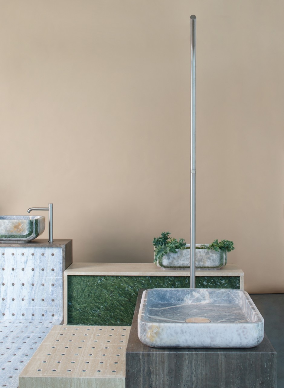 Nell’allestimento marmo e pietra sono espressi come materiali primordiali di costruzione e si uniscono a formare una giardino colorato: uno spazio permeabile delimitato da setti, pedane e gradoni di marmo, dove texture, lastre levigate o dai pattern tridimensionali sono alternate a strisce verticali di onici.
