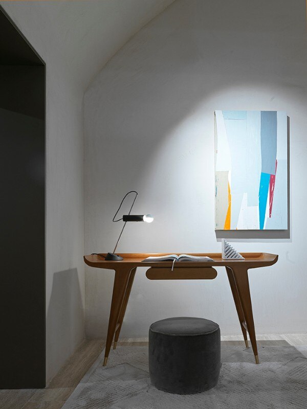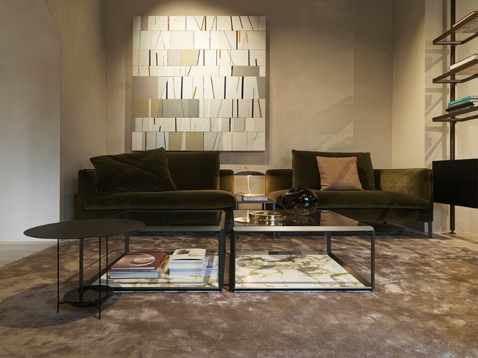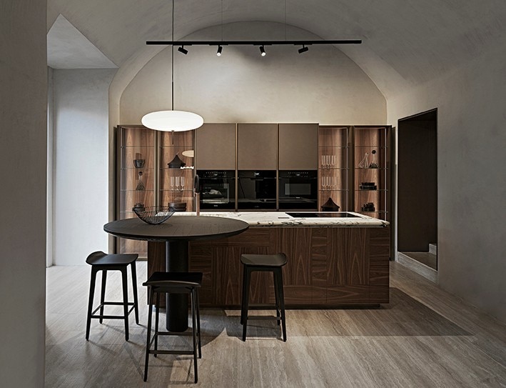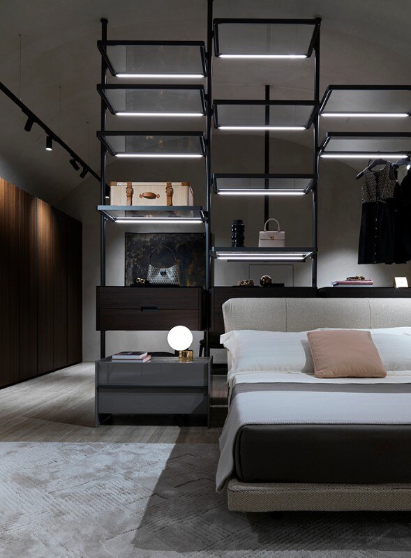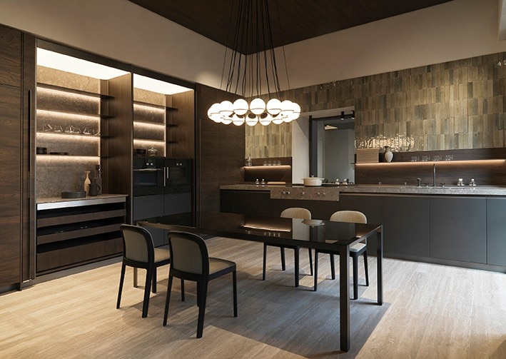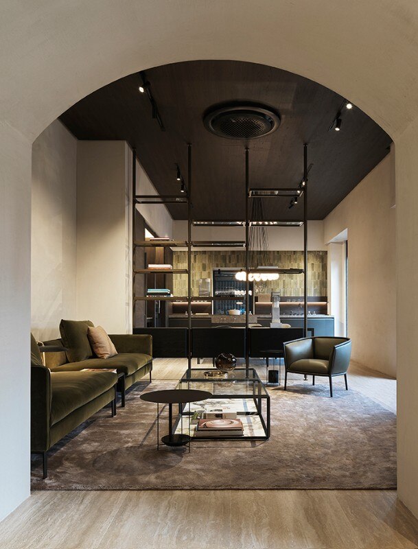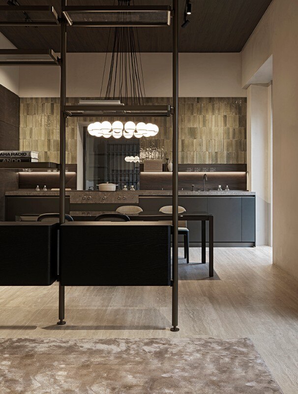 La zona cucina presenta una cucina Intersection, nell’essenza Rovere Thermo, mentre la zona notte inserisce una sequenza di armadi Gliss Master, una composizione Hector Night e un letto Azul. Nello showroom sono inserite anche opere di artisti contemporanei, come Luciano Romano, Steve Riedell, Marisa Albanese e Ttozoi.