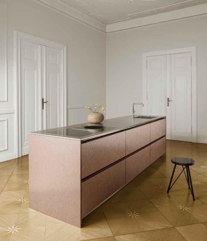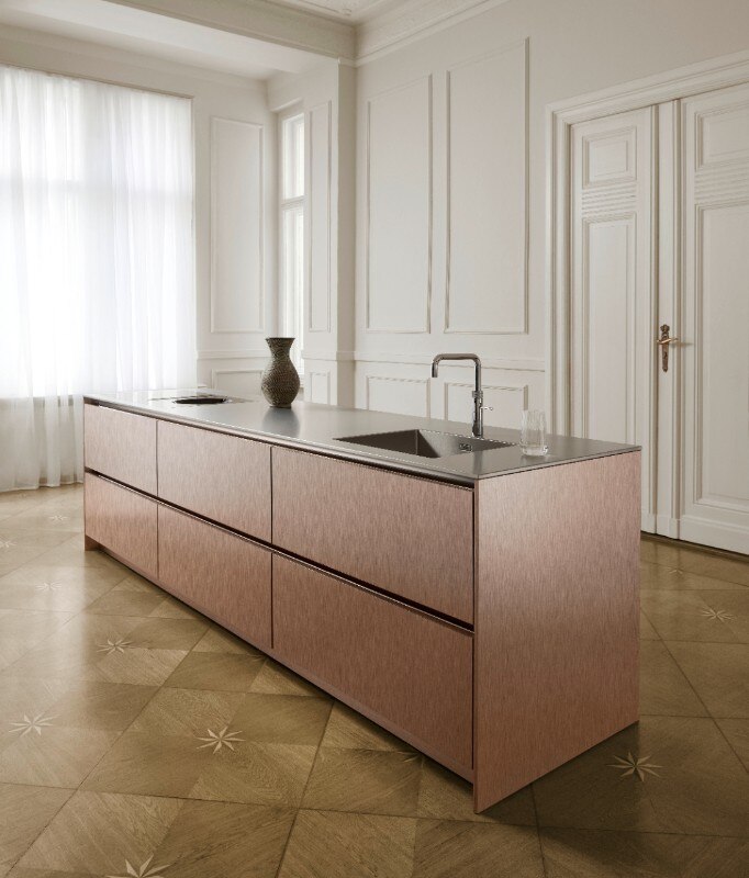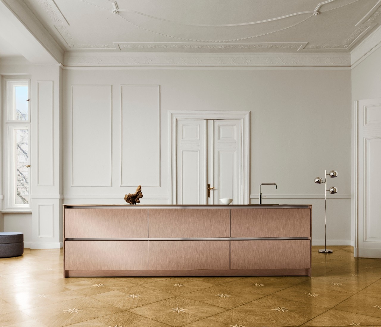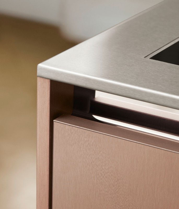 La SieMatic S2 si caratterizza per la forma discreta che vuole esprimere calma. Si compone di superfici in Metallic opaco nella tonalità Rosé Gold spazzolato, che riflette la luce con vari effetti. Il piano di lavoro in acciaio inossidabile e la gola in nichel lucido proseguono i giochi luminosi con le loro superfici brillanti e i loro riflessi.