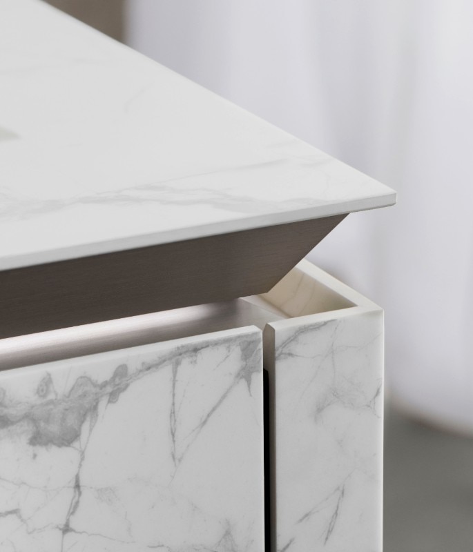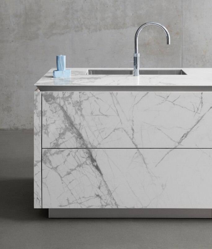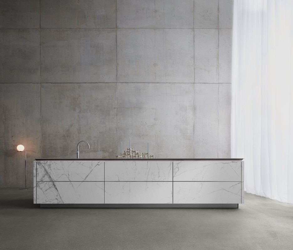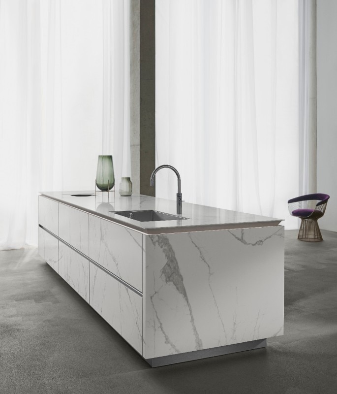 La SieMatic SLX Ceramic, cucina dagli angoli netti e dalle strutture piacevoli, rivisita l’assenza delle maniglie e rende tangibile la luce grazie al suo particolare sistema di illuminazione, che influisce direttamente sull’atmosfera dell’ambiente. La cucina è interamente avvolta in ceramica Syros Blanco con gola illuminata color acciaio inox e un piano di lavoro che sembra fluttuare.