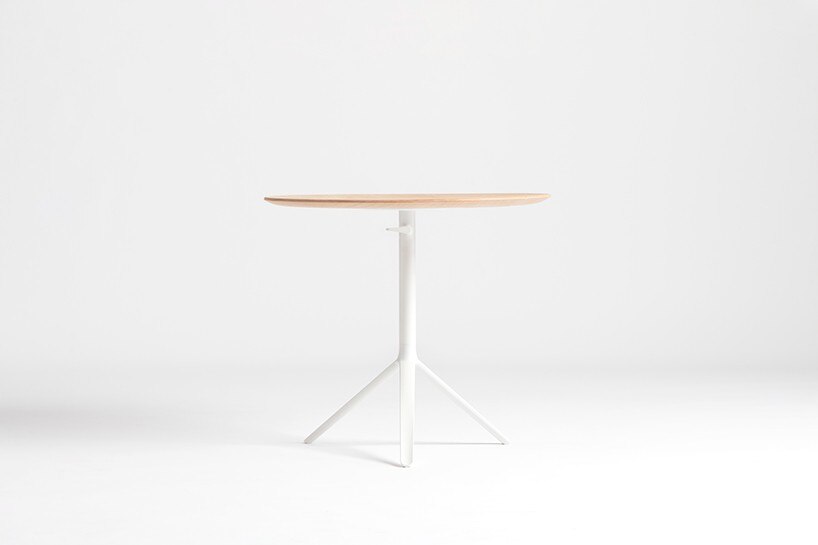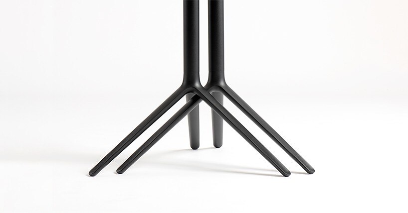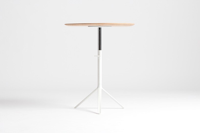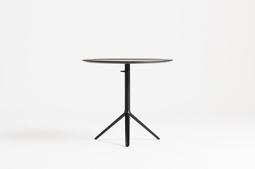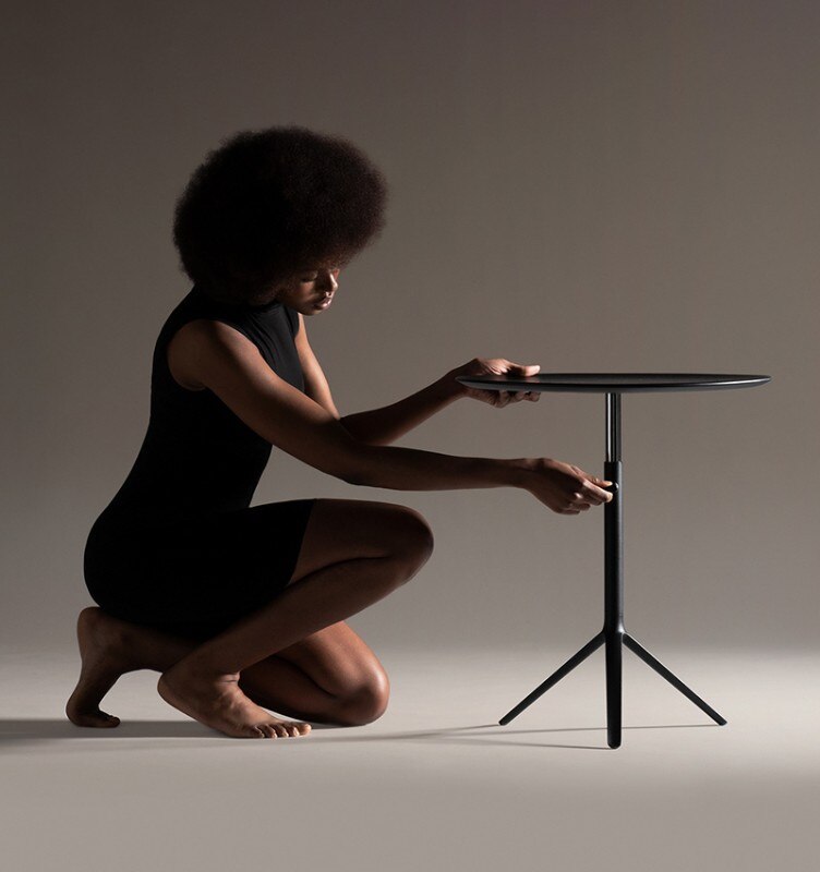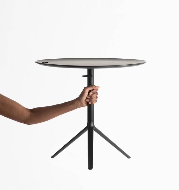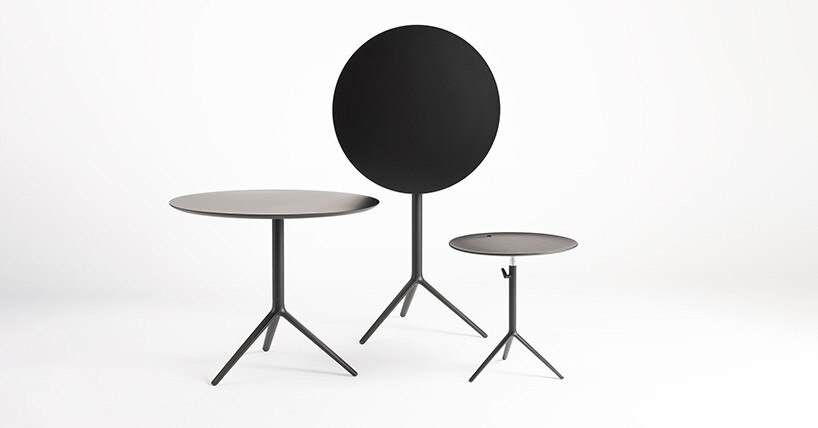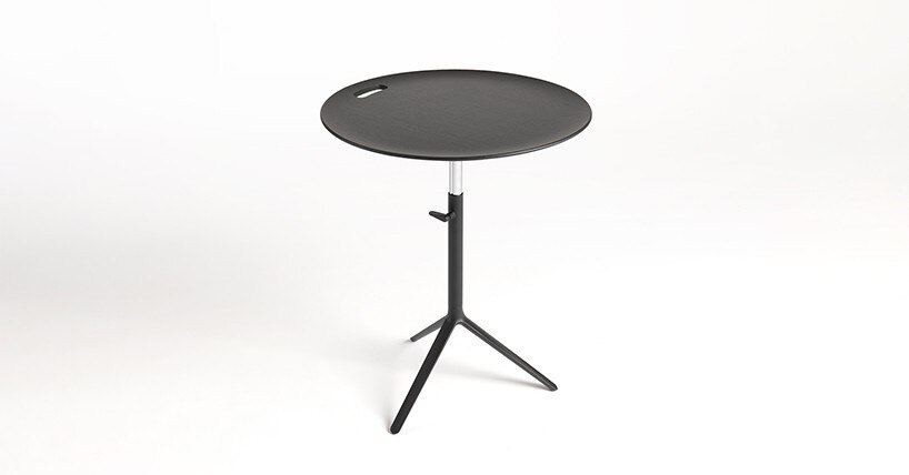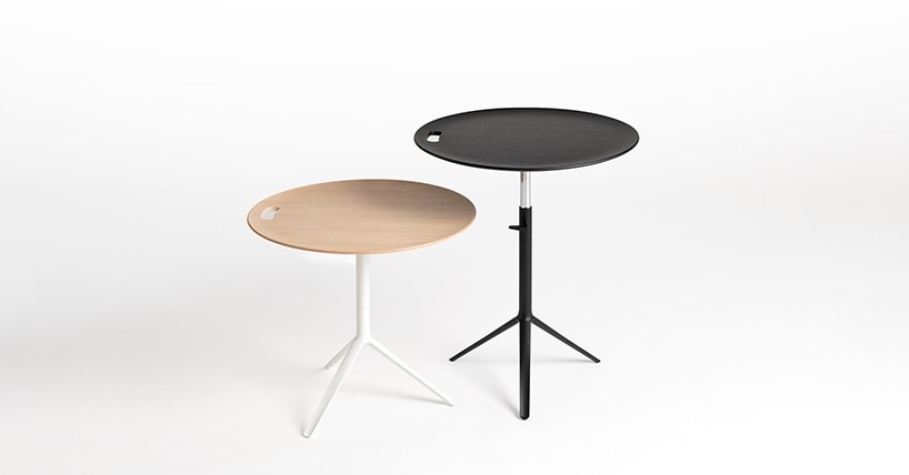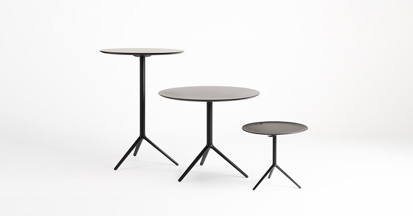 La collezione, caratterizzata dalla gamba a treppiede, include tre tipologie di tavolino: impilabile da bar, impilabile da dining e regolabile in altezza per diverse occasioni. La serie dimostra come la produzione industriale possa generare forme espressive e delicate, modellate apparentemente dalla mano di un artigiano.