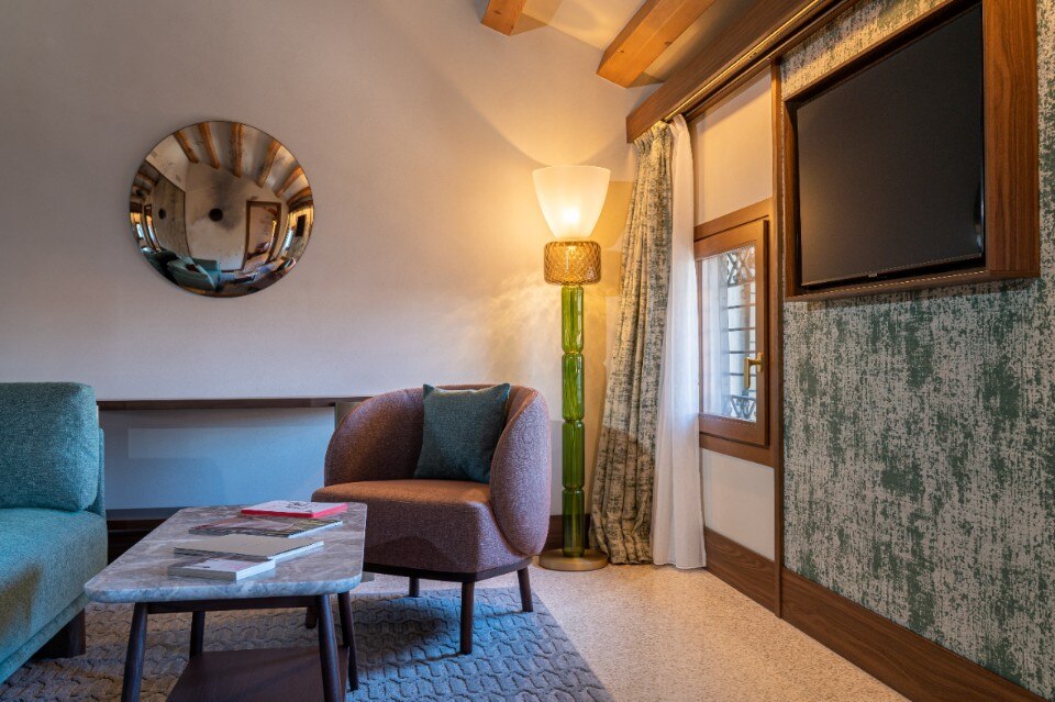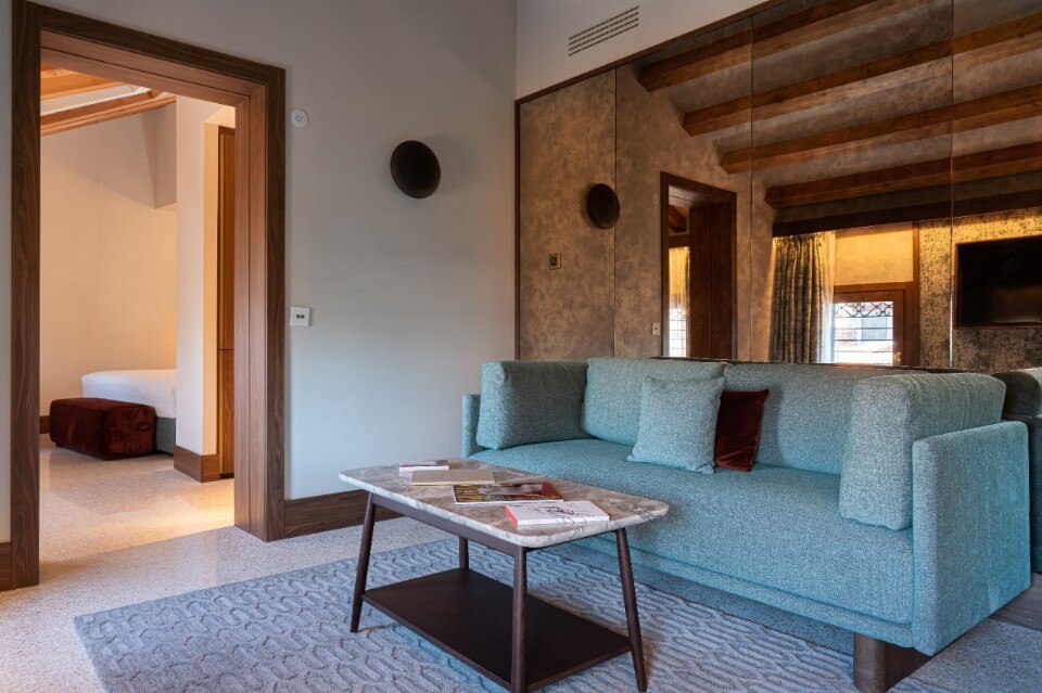 La struttura accoglie la Sala Lettura, il bar Alchemia, due ristoranti – Essentia e Vero – che propongono piatti gourmet realizzati con ingredienti locali, e tre giardini. La lobby ospita sul soffitto a doppia altezza un lampadario composto da 14.000 cristalli in vetro di Murano. Sono invece 66 le camere – 57 Suite e 9 Deluxe – arredate da Molteni&C con pezzi custom-made disegnati da Patricia Urquiola. Del brand sono i controsoffitti in legno, i rivestimenti in tessuto e le panche dei corridoi. I tavoli Filigree di Rodolfo Dordoni e le sedie Woody di Francesco Meda sono inoltre state scelte per gli ambienti interni.