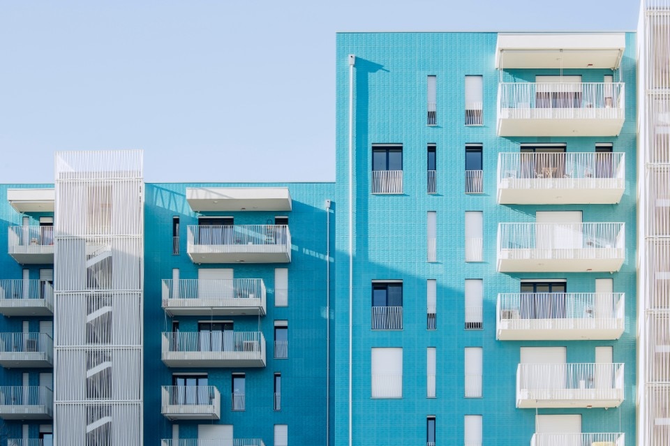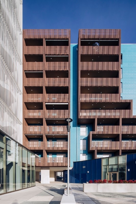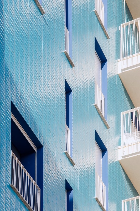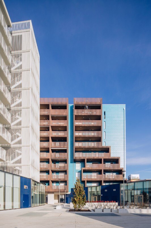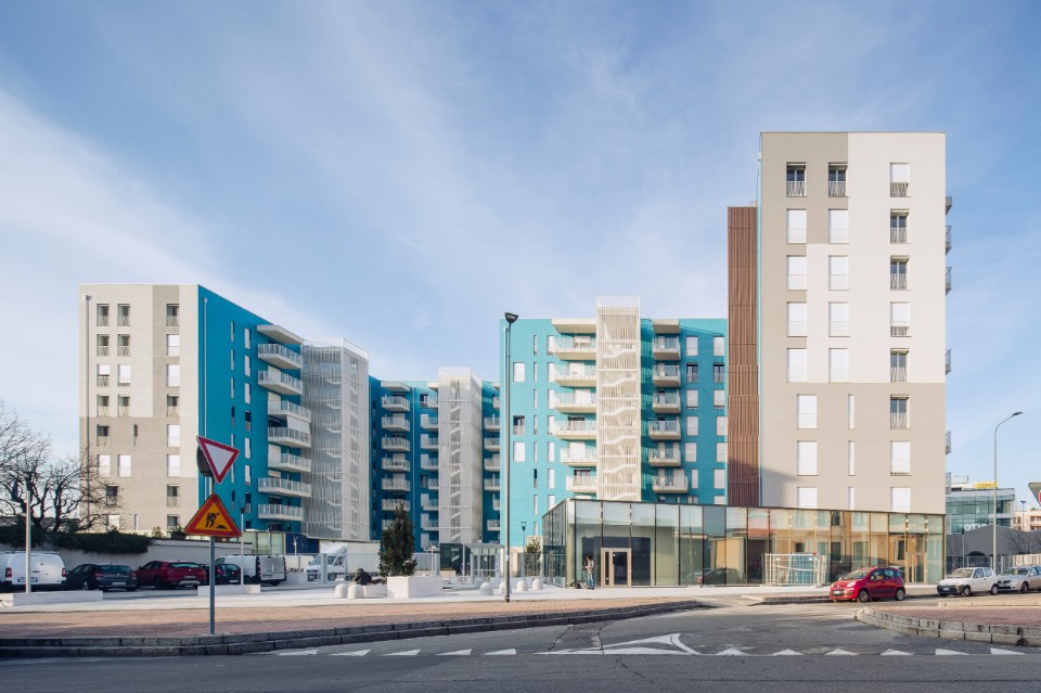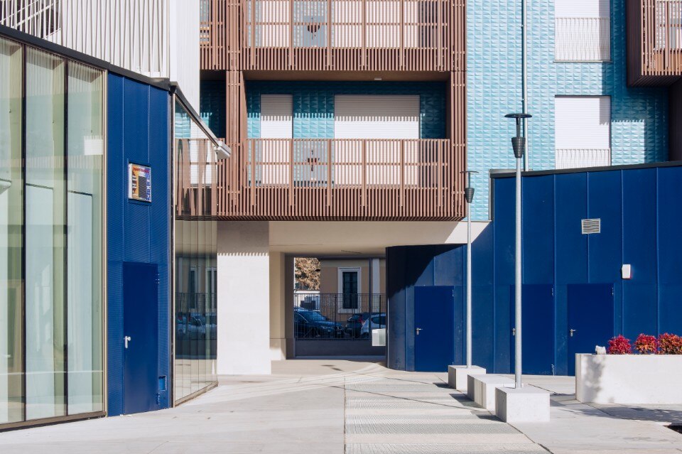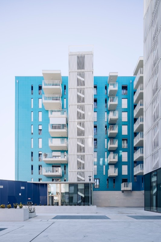 Il complesso residenziale si caratterizza per le facciate rivestite da un lato con intonaci di colore diverso e dall’altro con lastre in gres porcellanato blu iridescente e tridimensionale della collezione Diamante Boa di Casalgrande Padana, posate con tecnica ‘a giunto zero’. Le sfaccettature delle piastrelle sono ispirate al taglio a diamante, dando forma a superfici luminose.