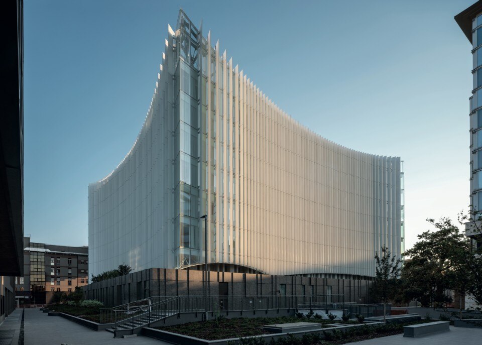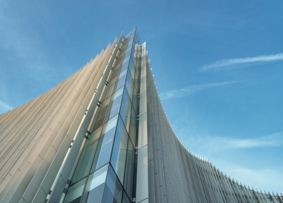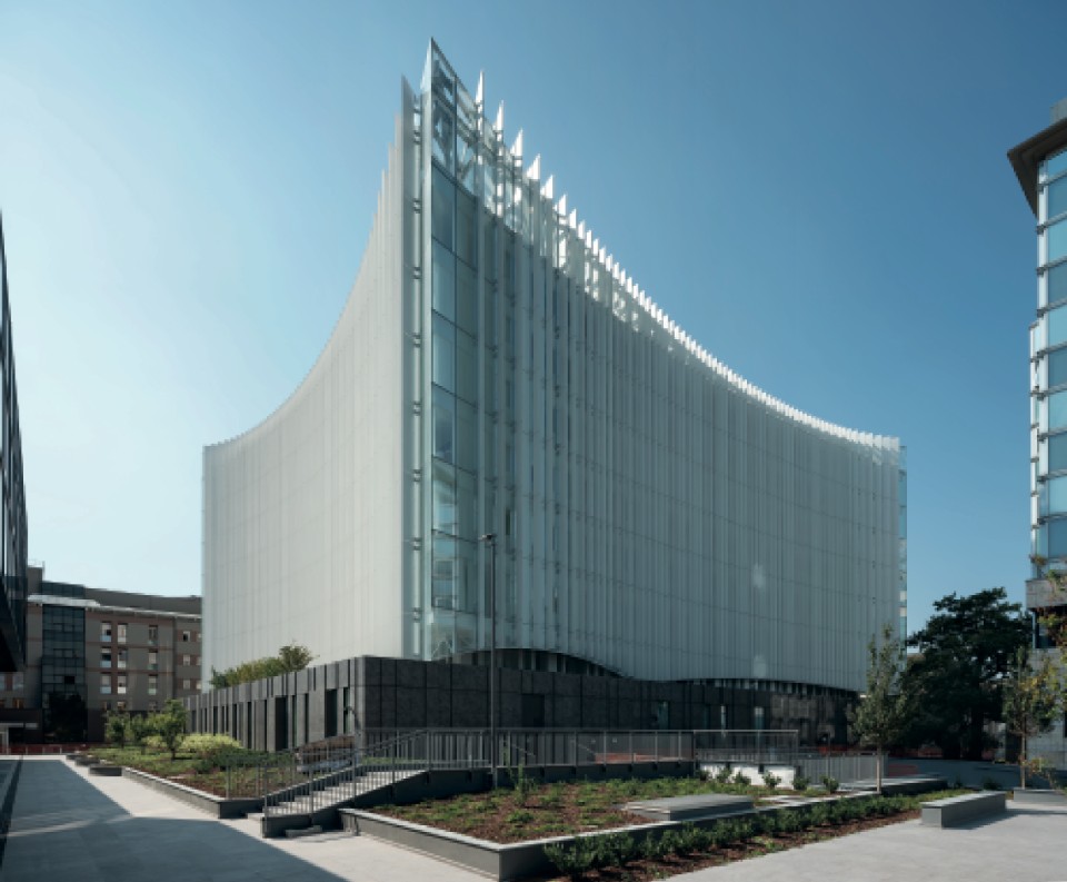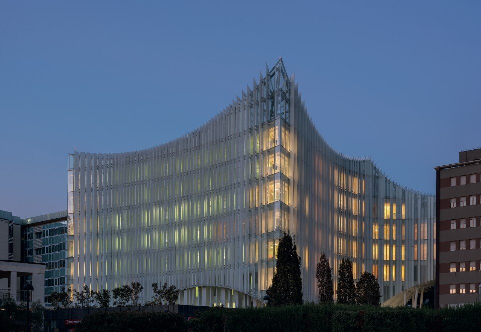 Caratterizzato da un involucro edilizio in vetro, il nuovo polo presenta una serrata scansione dei prospetti con una lieve curvatura, che varia lungo il perimetro, per un maggiore apporto di luce naturale nella parte centrale della facciata. Lamelle verticali frangisole svolgono una doppia funzione bioclimatica.