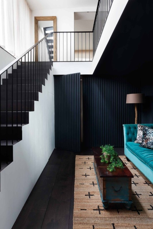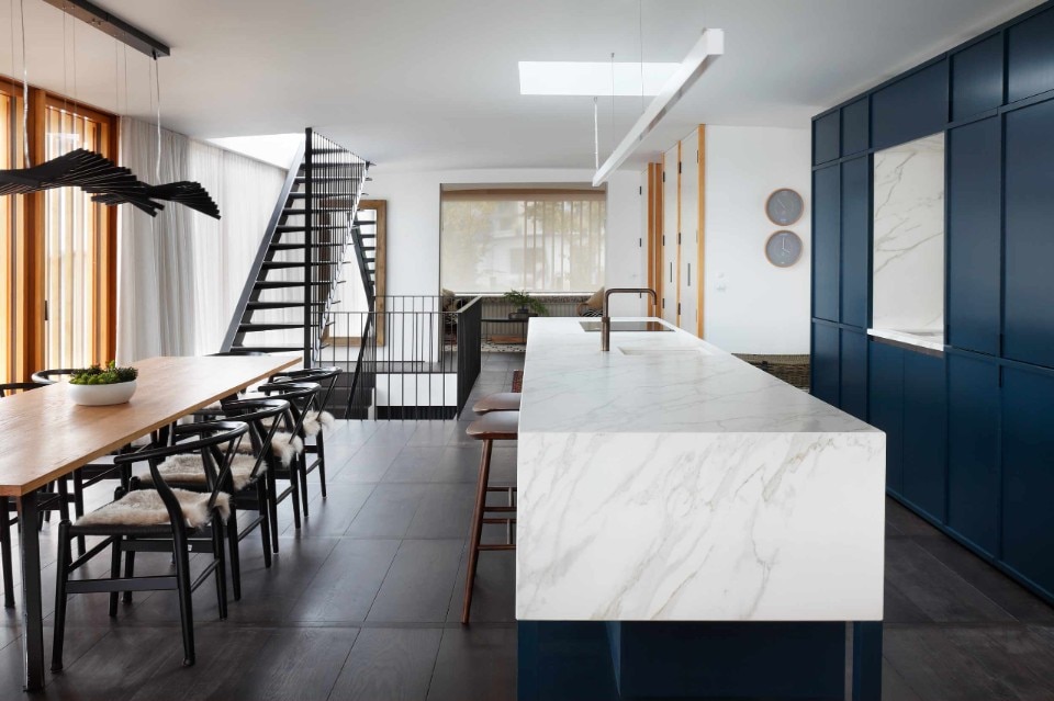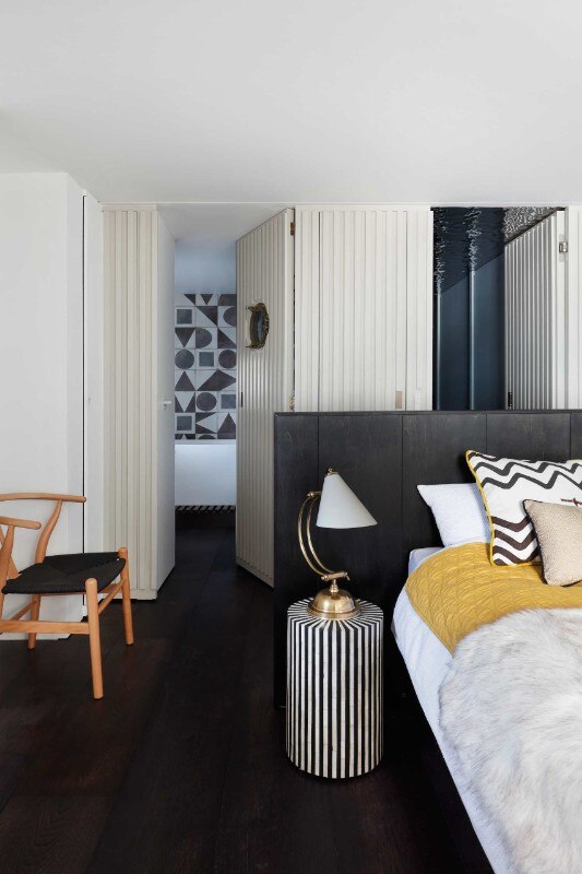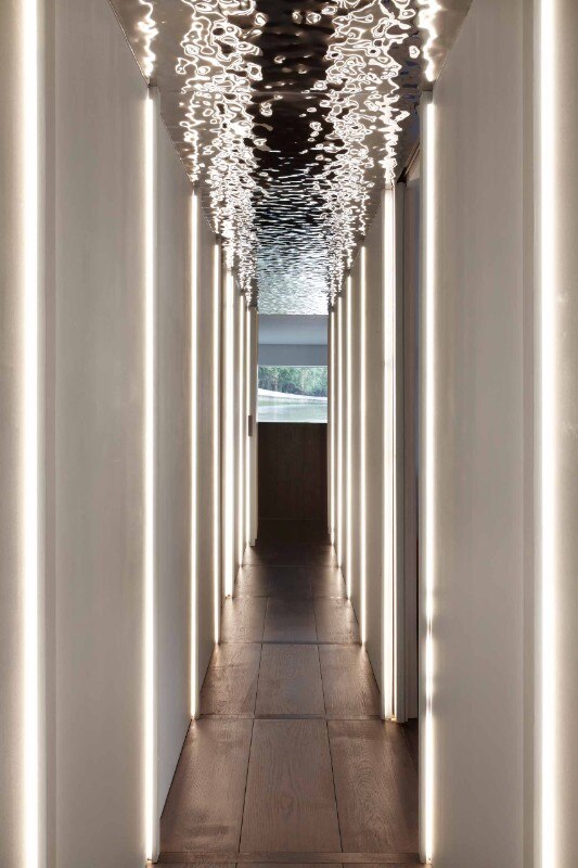 I colori e i materiali scelti – bianco, blu, nero e legno – sono il filo conduttore del progetto. Il corridoio di distribuzione delle camere da letto è enfatizzato da faretti e da una lastra metallica martellata a soffitto, che movimenta il percorso ispirandosi alla scia d’acqua lasciata da un’imbarcazione in movimento.