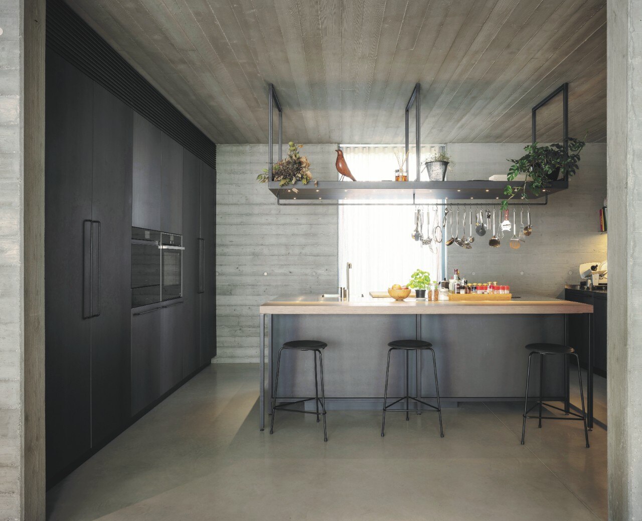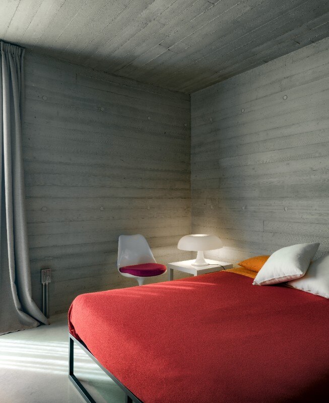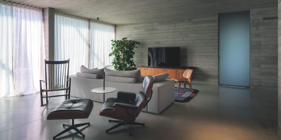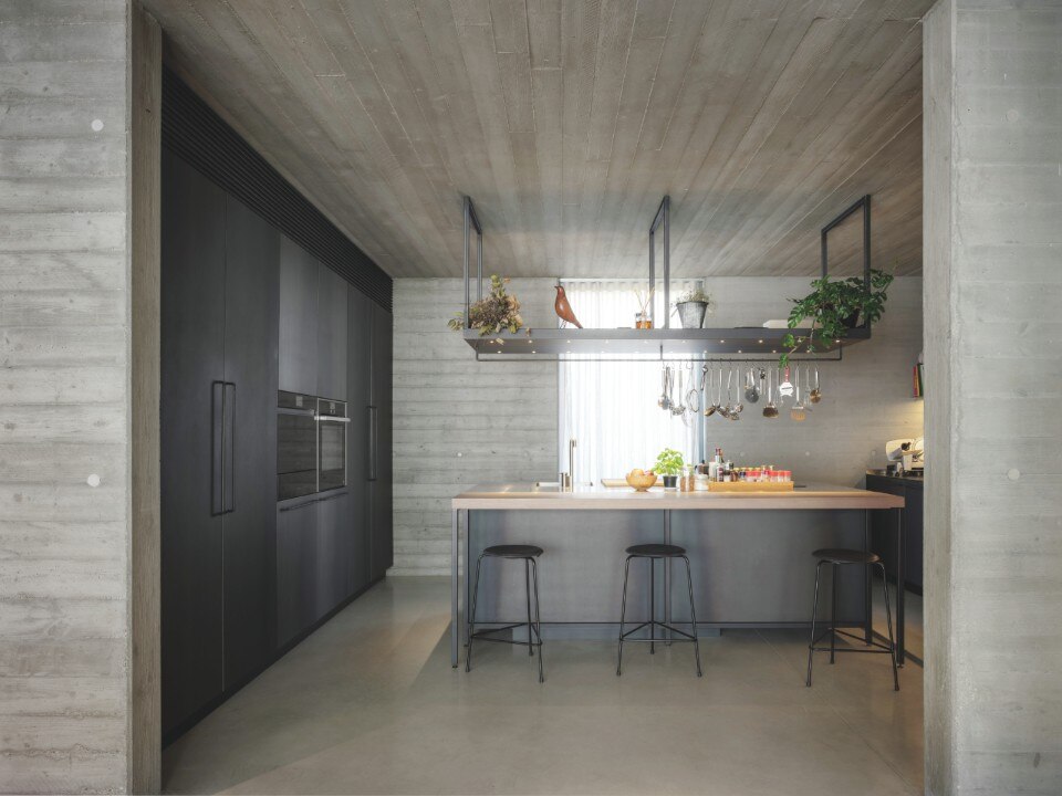 Il calcestruzzo, utilizzato per l’involucro architettonico, propone varie ispirazioni alla natura: le pareti in cemento sono state realizzate con una texture lignea e le pavimentazioni cementizie in Deco Nuvolato di Isoplam, caratterizzate da sfumature nella tonalità Light Grey, hanno l’obiettivo di fare entrare i colori vibranti del giardino negli spazi della casa.